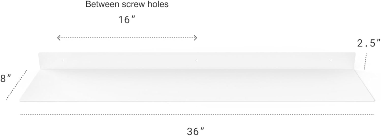- DIMENSIONS & DETAILS: Measuring 36-inches long x 8-inches in depth, our steel floating shelf is made from 14 gauge raw steel and professionally powder coated white. The weight of the shelf is 8 LBS. It's perfect for displaying books, plants, bottles, picture ledges, and retail displays