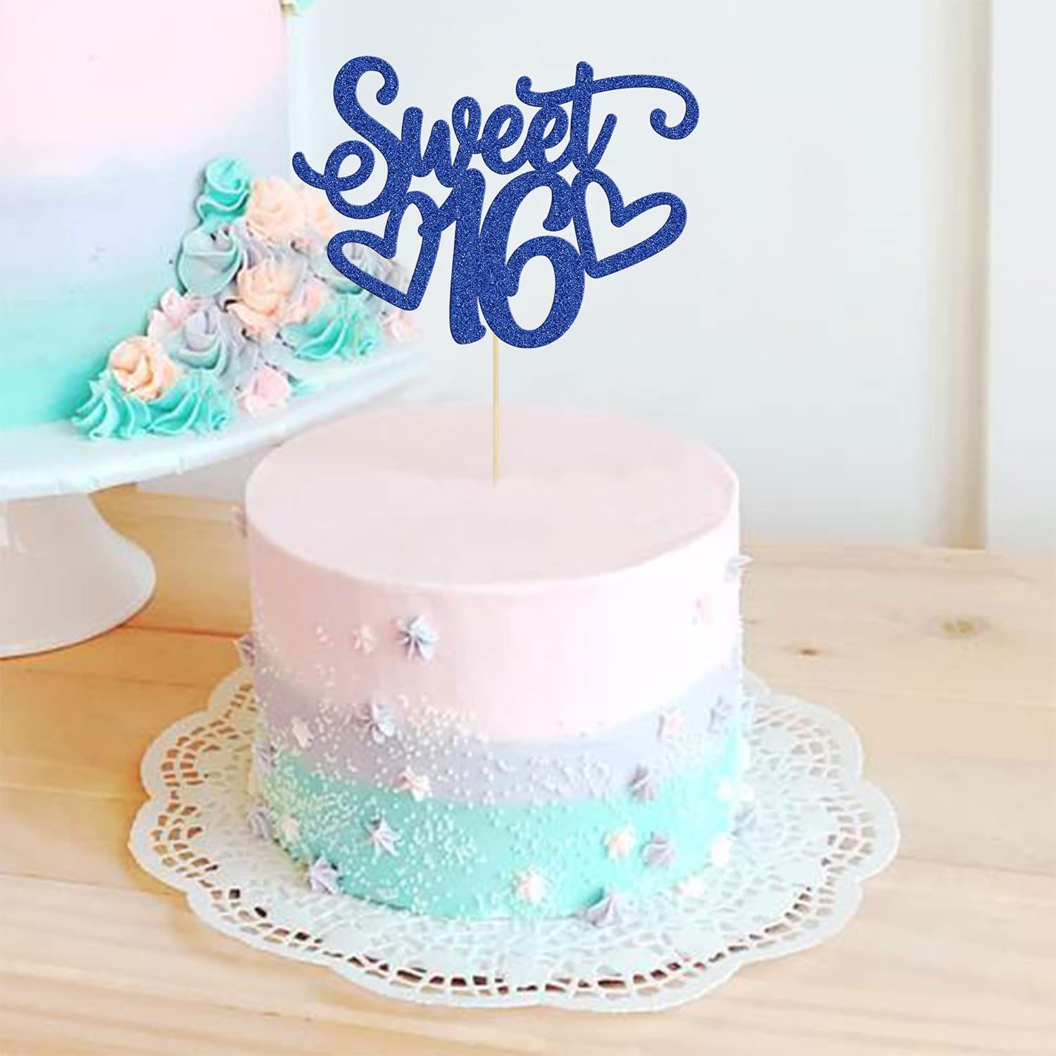 Gyufise 1Pc Sweet Teenager 16 Cake Topper Glitter 16th Birthday Cake Pick for Cheers to 16 Years Old 16th Birthday Party Cake Decorations Supplies Blue