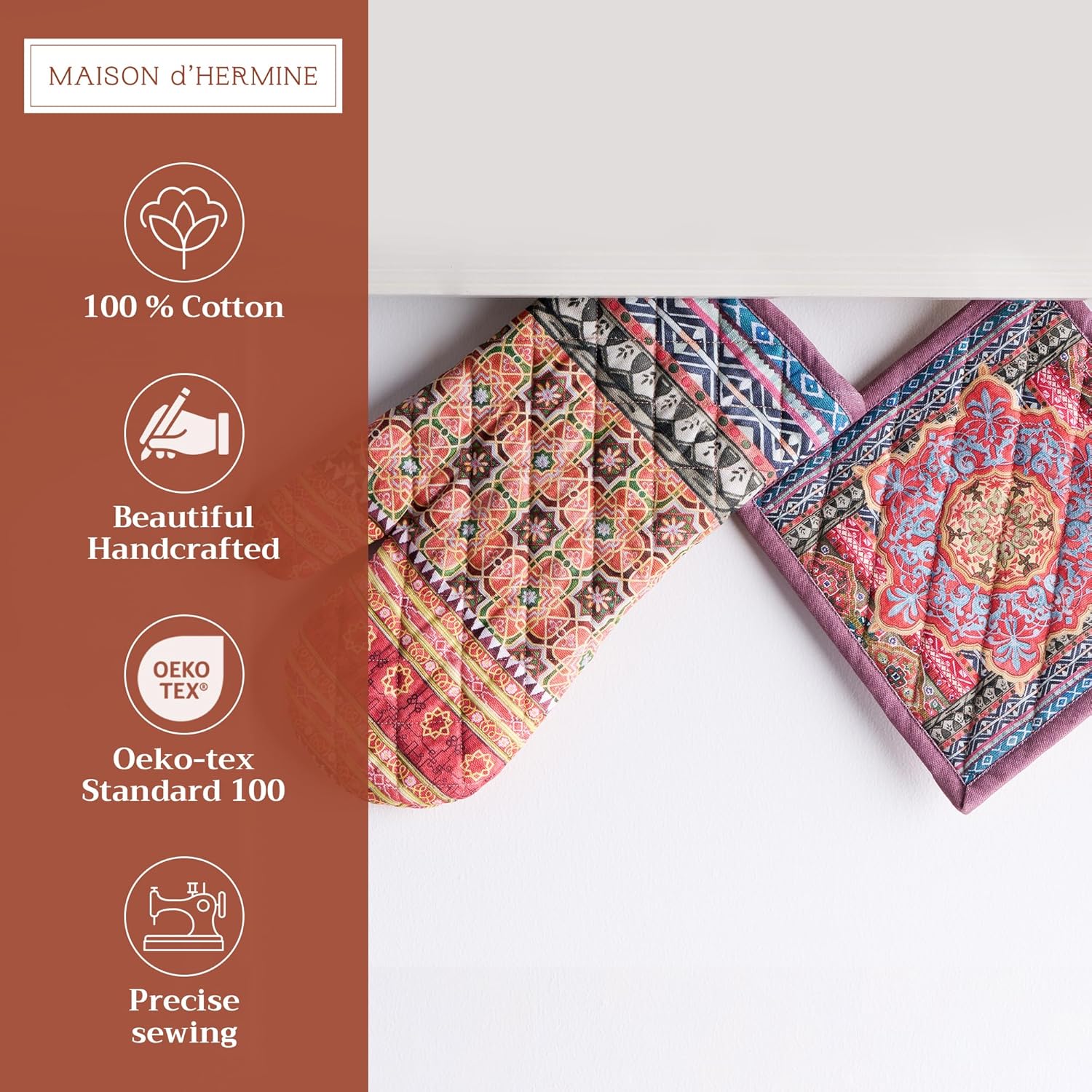 - Package includes: Set includes 1 oven mitt (7.5 x 13") and 1 pot holder (8 x 8"), perfect for baking, roasting, and cooking. Made from 100% cotton for reliable protection. Our products are Designed in Europe and Made in India