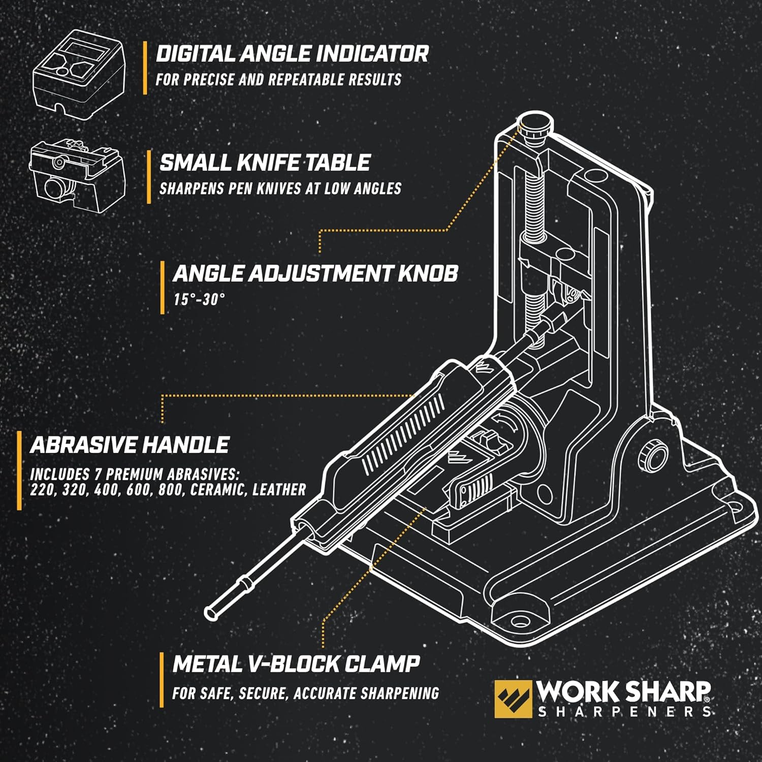- ADJUSTABLE SHARPENING ANGLES: The included digital angle indicator allows you to adjust the sharpener's angle from 15 to 30 degrees. This allows you to provide a clean sharpen to your knife or tool.