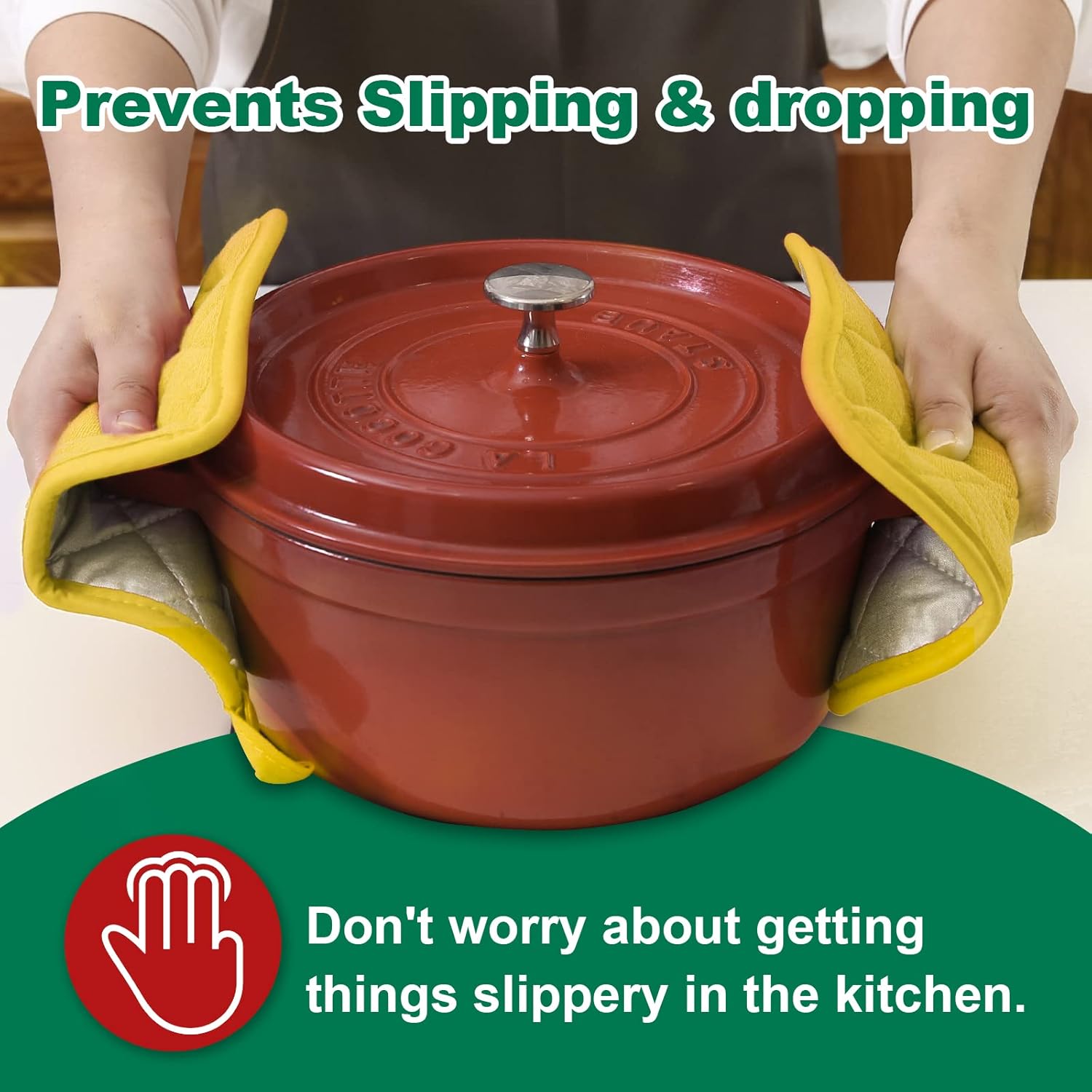 - PROTECT YOU FROM HEAT - The construction of these pot holders for kitchen helps to protect your hands and arms from the heat of the oven. Do not use pot holders in a hot oven or over an open flame.