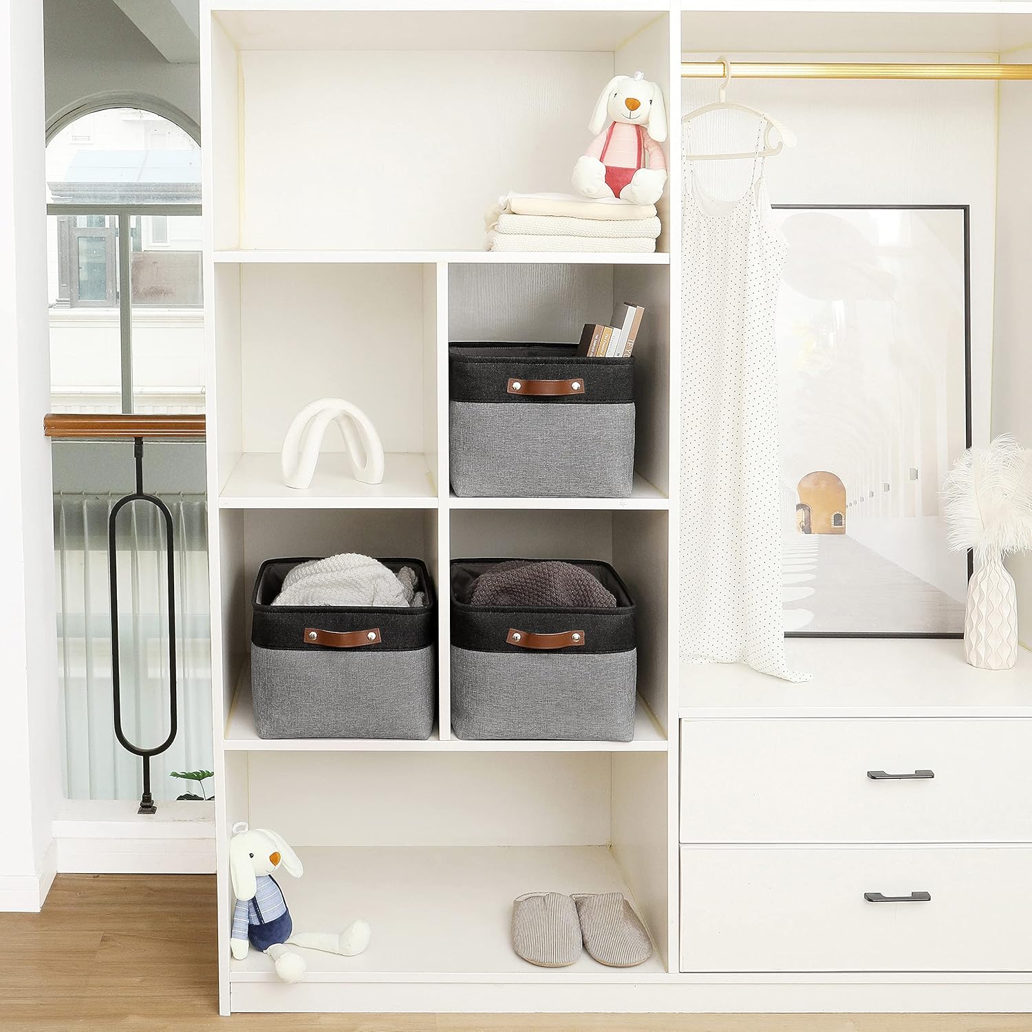 - Decorative Fabric and Vegan Leather β These versatile storage baskets for organizing your everyday life are made with a thick, high-quality fabric and fitted with leather handles to add a stylish touch to a living room, bedroom, office, or personal space.