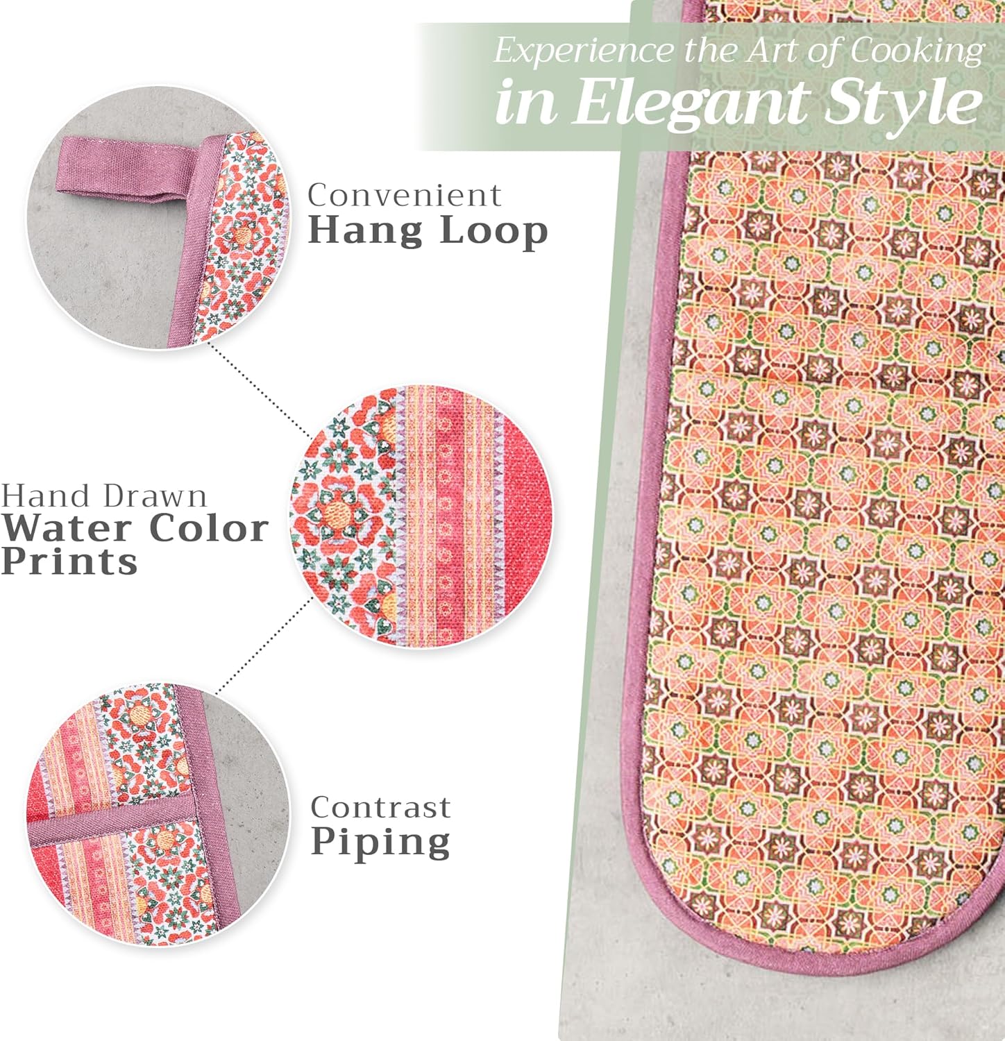 Maison d' Hermine Double Oven Mitts 100% Cotton 7"x35" Double Oven Mitt Heat Resistant BBQ Cooking Gloves with Loop, Baking, Grilling, Home, Kitchen, Handling Hot Pans (Ispahan)