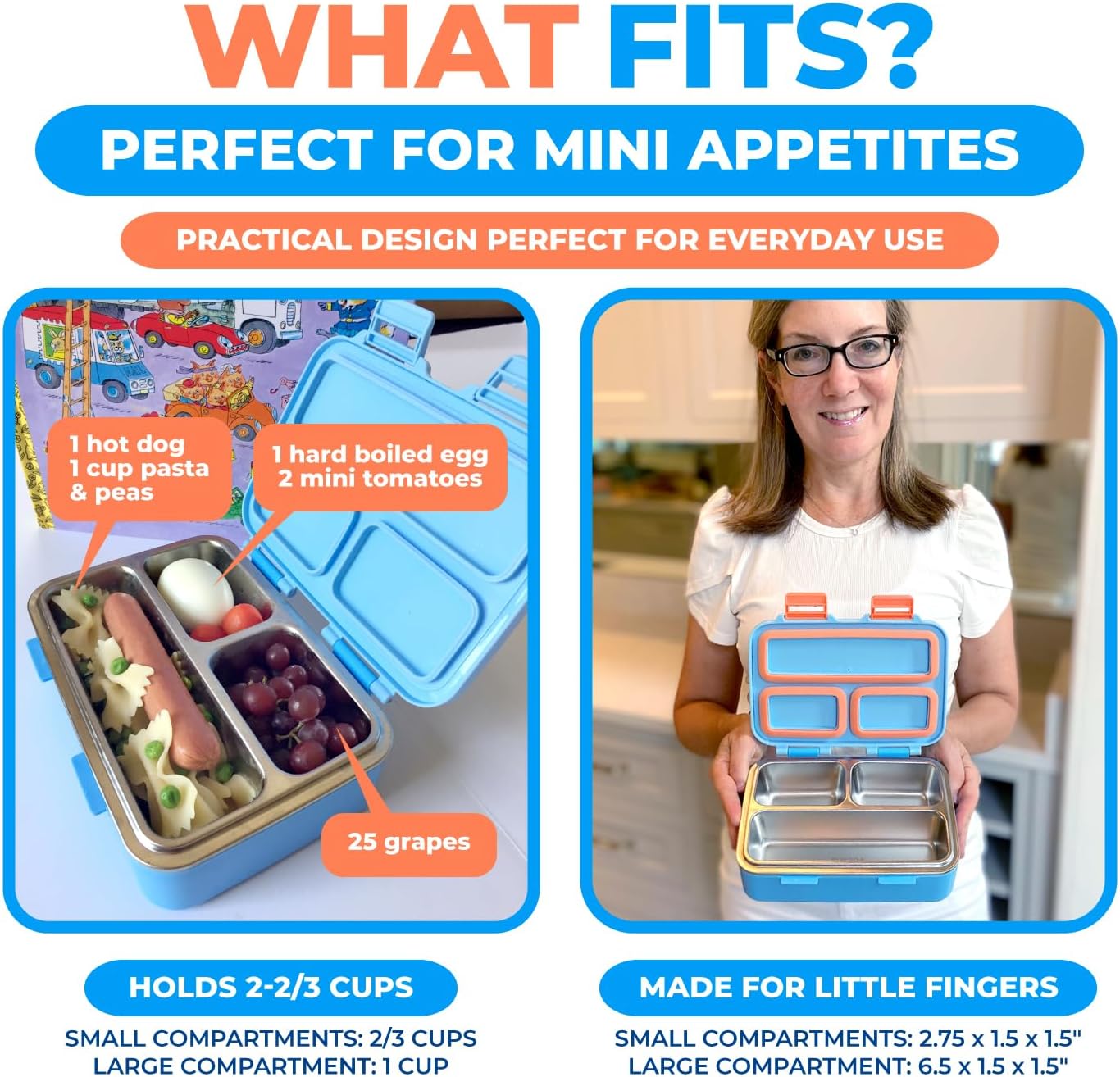 - PREMIUM STEEL BENTO BOX SET Make lunches and snacks fun and healthy at daycare, pre-school or on the go with our award winning stainless steel bento lunch box, cute coordinating insulated bag and water bottle set. Mini size is perfect for baby, toddlers and small appetites. Includes utensil / spork. BPA free. AGE 3+ Light insulation in the lid. HOLDS 2-2/3 cups/18 oz/550 ML. SEE PHOTOS to understand what this holds.