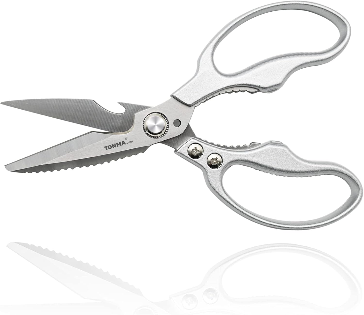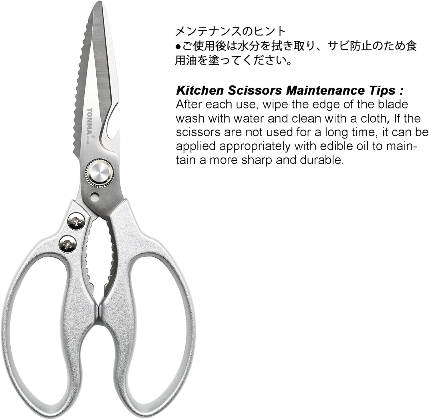 - [ RESTAURANT GRADE KITCHEN SHEARS ] - The blades of kitchen shears heavy duty powerful are made of high-strength Japanese SK4 heavy duty stainless steel (4mm blades thickness, HRC: 60ยฑ1), the TONMA multipurpose kitchen scissors all-purpose have heavy-duty built quality lasts a lifetime, great as herb scissors, cooking food scissors, utility scissors, craft scissors, tailor fabric scissors.
