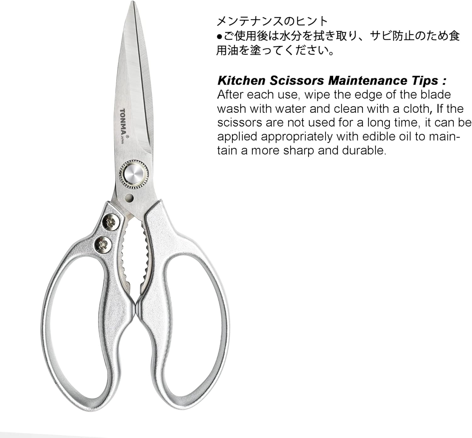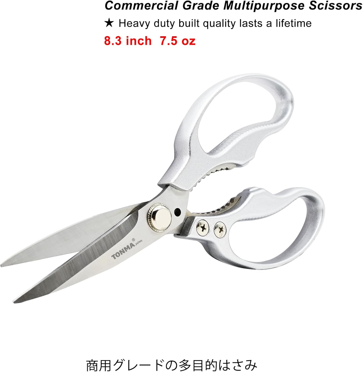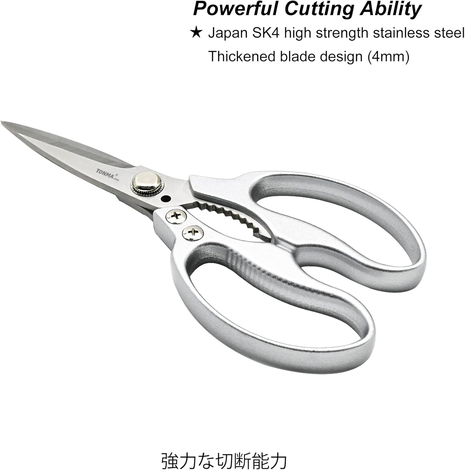 - [ INDUSTRIAL QUALITY KITCHEN SHEARS ] - The blades of all purpose kitchen shears powerful are made of high-strength Japanese SK4 heavy duty stainless steel (4mm blades thickness, HRC: 60ยฑ1), the TONMA multipurpose kitchen scissors all-purpose have heavy-duty built quality lasts a lifetime, great as herb scissors, cooking food scissors, utility scissors, craft scissors, tailor fabric scissors.