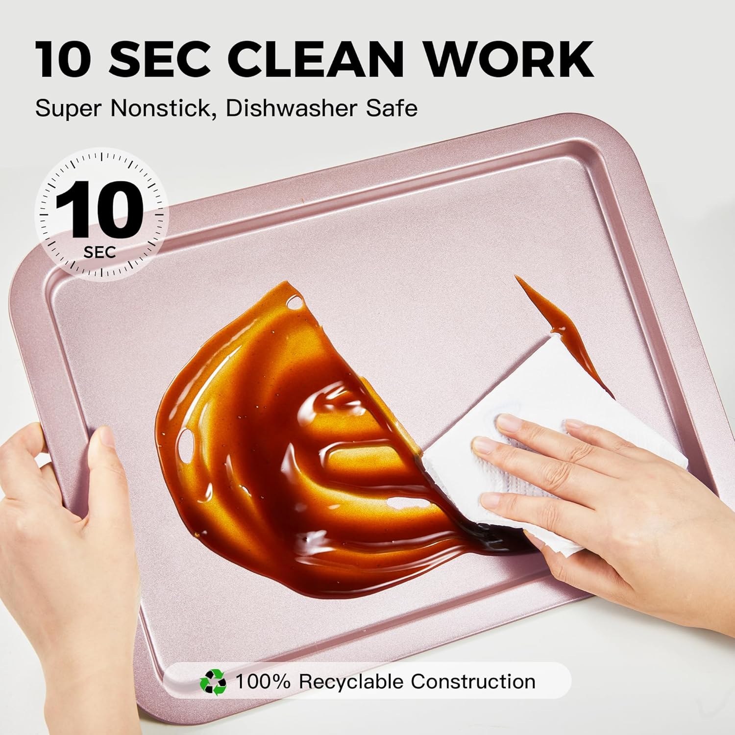 HONGBAKE Baking Sheet Pan Set, Cookie Sheet for Oven, Nonstick Bakeware Sets with Wider Grips, 3 Pack Half/Jelly Roll/Quarter Baking Tray, Premium, Dishwasher Safe-Pink