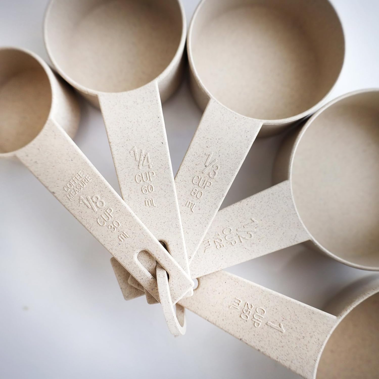 - 14PC KITCHEN UTENSILS SET - Do some of your old kitchen utensils need an upgrade? Why not make it a sustainable one? 14pc set comes with an ice cream scoop, cheese grater, vegetable peeler, pizza cutter, measuring cups, and measuring spoons, all made from wheat straw in a modern and fresh cream-speckled matte finish