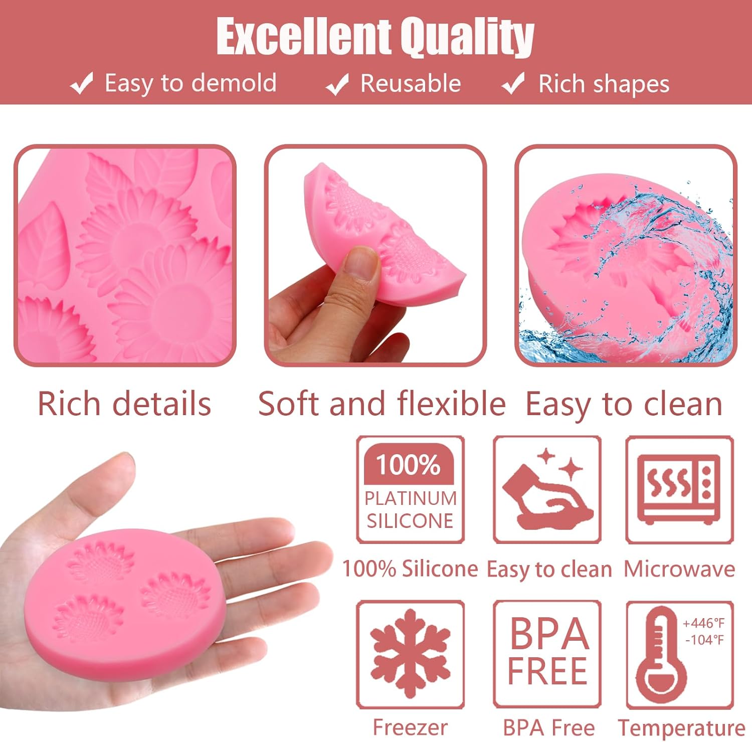 - [PREMIUM MATERIALS]: Sunflower Silicone Fondant Molds are Made of Food-Grade Silicone, Durable. Can be Used in Environments From -104Β°F to +446Β°F. Reusable in Microwave, Oven, Freezer and Dishwasher.