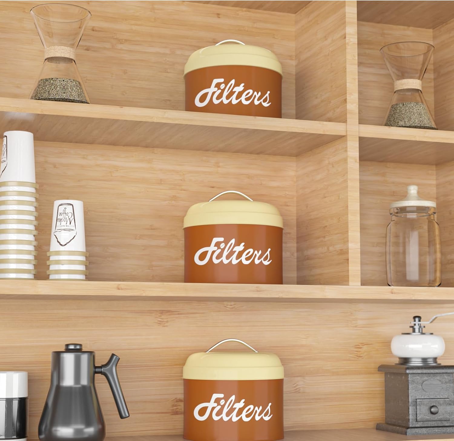 - 【STURDY COFFEE BAR DECOR】 Our coffee filter holder storage is made from food-safe, powder-coated galvanized steel and it won't break after long time of use. Smooth surface are straightforward to clean, wipe with a damp cloth. It is a nice decoration in your Kitchen Counter, coffee bar decor