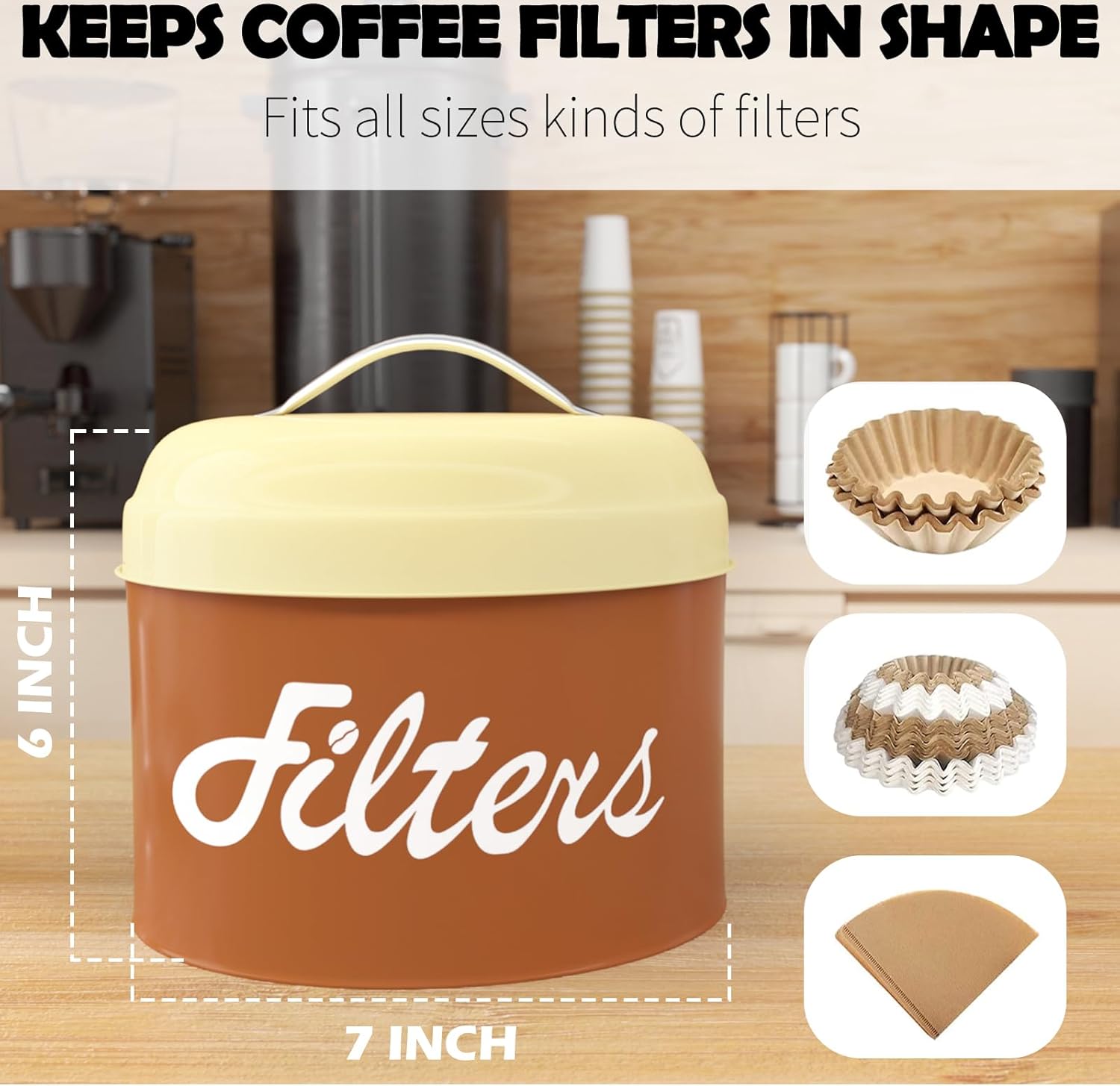 - 【KEEPS FILTER FROM LOSING SHAPE】 This round coffee filter holder measures 6.2" in diameter x 6" high, large can keep your coffee filters from losing shape and adds class to your home or coffee bar. Add style and functionality with this rustic farmhouse coffee bar organizer.
