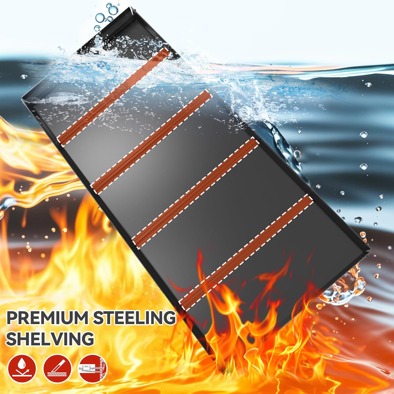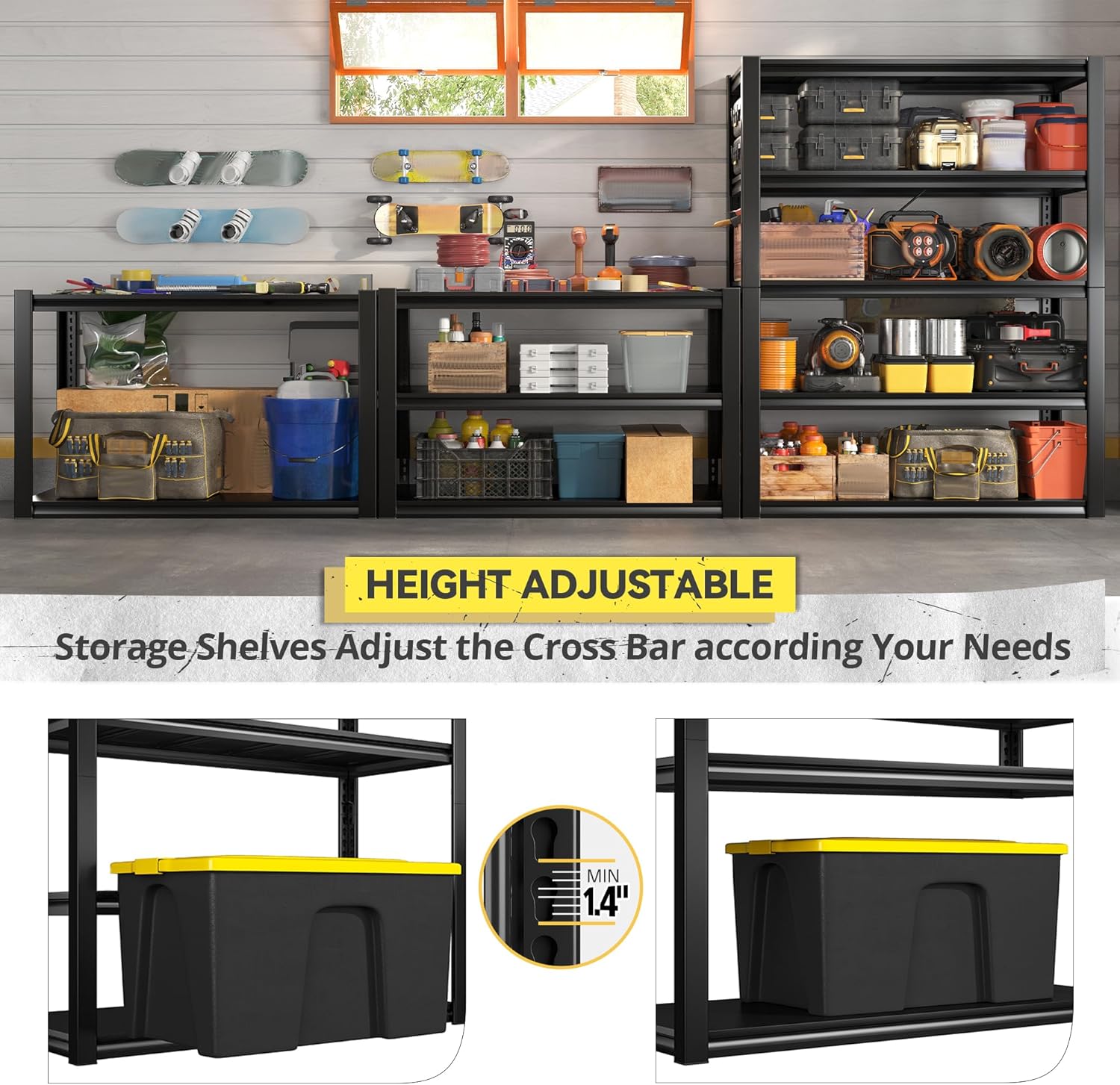 - 【Sturdy and Durable Garage Shelves】 No wobbling or shaking when fully loaded as two-layer vertical support bars will help distribute the pressure. Each metal board has 3 support ribs that ensures no dent or deformation. The storage shelves lasts for decades for all storage needs and meets your expectations