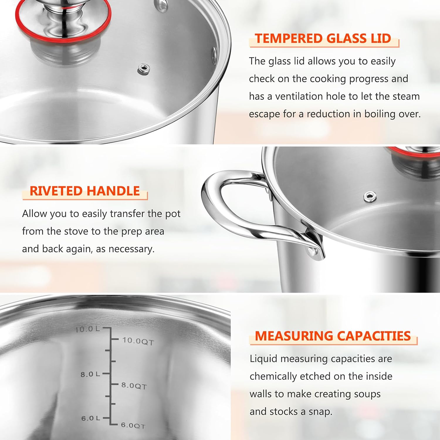 - 18/10 STAINLESS STEEL - Premium quality 18/10 stainless steel won't corrode, rust, or react with food, No warping, cracking or chipping, No need to worry about toxic materials cooking into your food, Healthy and durable for all your cooking, simmering and big boiling needs, Easy to clean and dishwasher safe