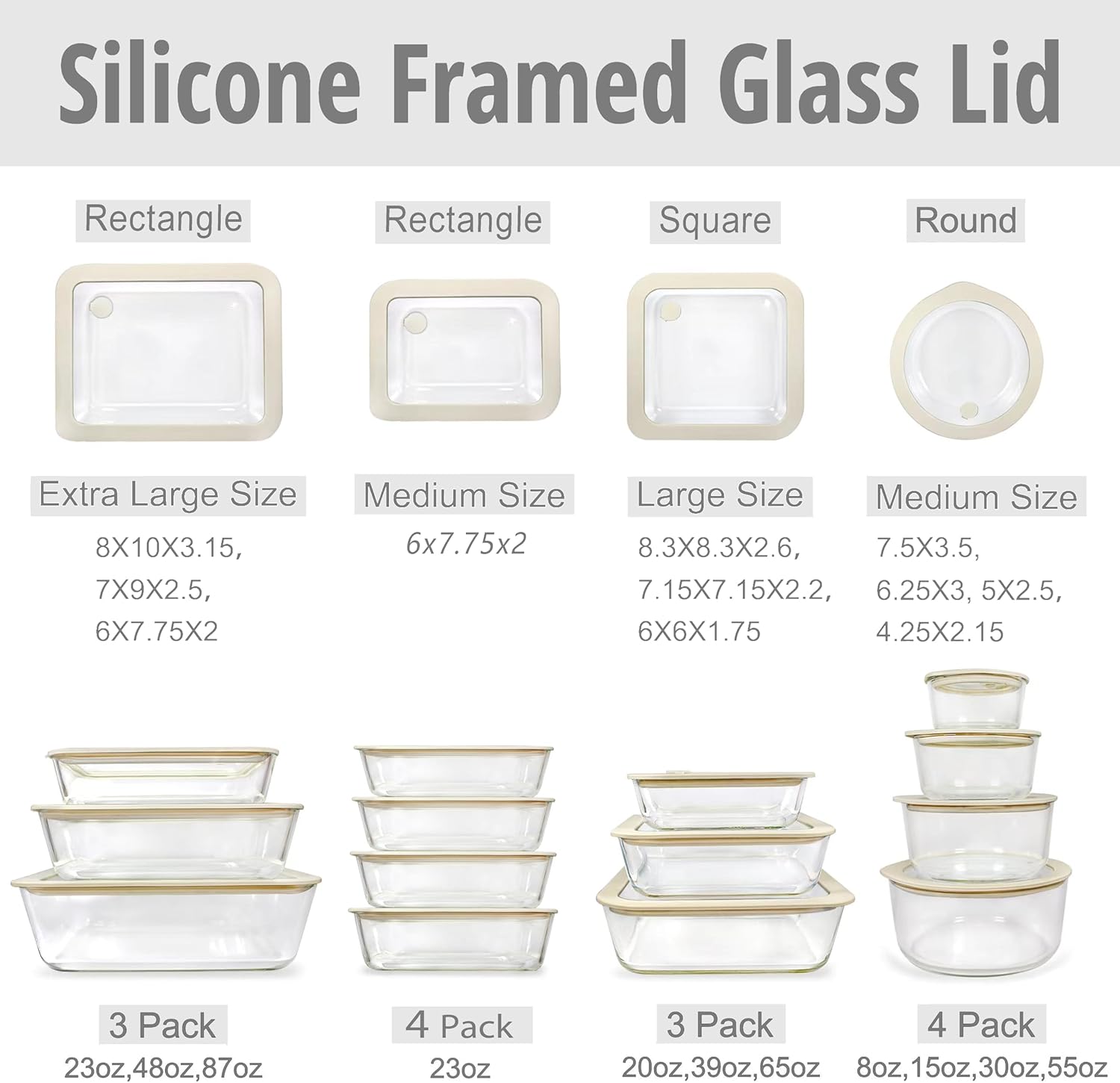 - ✅WHAT’S IN THE BOX: Each set comes with the Glass containers and their matching Silicone Framed Glass Lids. Rectangle Shape Size : 87oz, 48oz, 23oz, (8x10x3.15, 7x9x2.5, 6x7.75x2)
