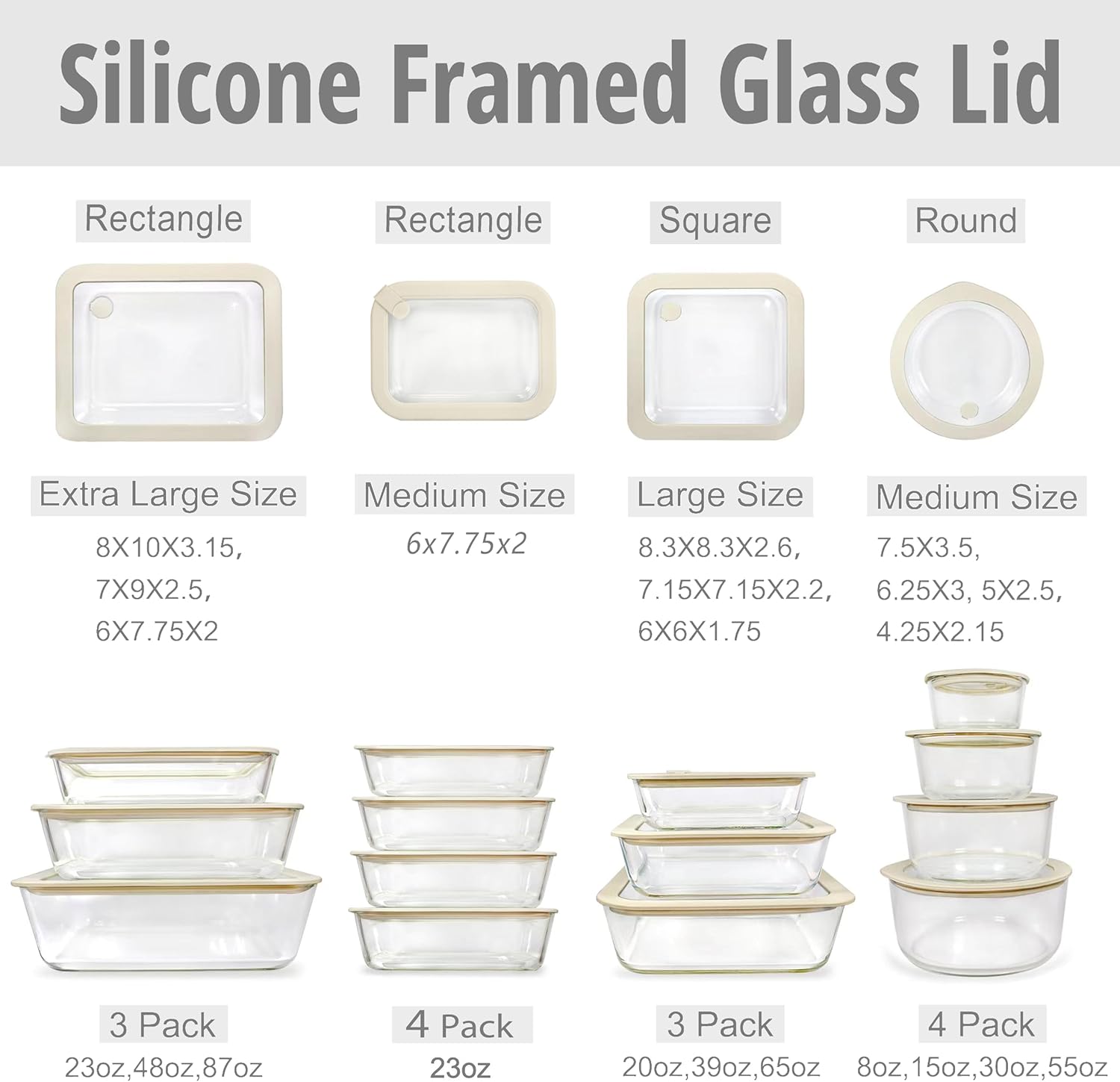 - ✅WHAT’S IN THE BOX: Each set comes with the Glass containers and their matching Silicone Framed Glass Lids. Round Shape Size: 55oz, 30oz, 15oz, 8oz,(7.5x3.5, 6.25x 3, 5x2.5, 4.25x2.15)