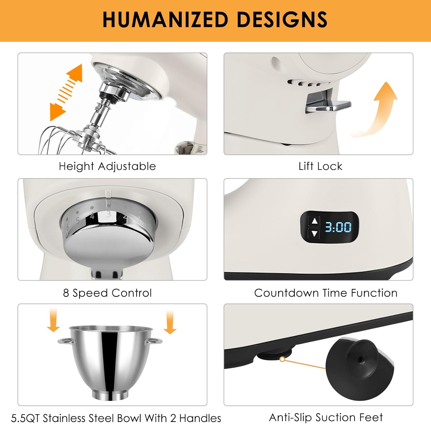 - 【6 Ingenious Designs for Easy to Use】1.All accessories of the mixer for baking are dishwasher safe. 2.The tilt-head design of the electric stand mixer is easy to adjust. 3.The lighting of cake mixer is convenient to check the mixing status. 4.The low-noise high-torque DC motor makes the mixing sound less than 70 dBa. 5.The 8-level constant speed control is suitable for various recipes, and knob adjusts smoothly. 6.The display screen shows the mixing time and can be timed.