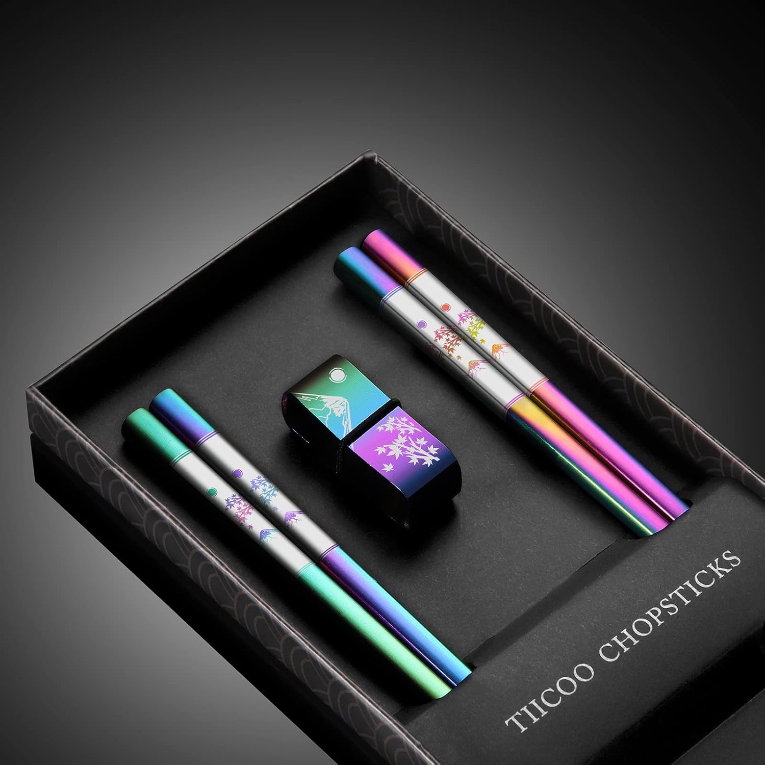 - 【Elegant Titanium Coating】Featuring a luxurious titanium-plated finish in sophisticated colors, each chopstick showcases exquisite laser-engraved Japanese motifs of mountains and maple leaves. This advanced coating provides exceptional durability that won't fade, peel or scratch even after years of daily use. The rich luster elevates your dining experience while maintaining practical strength.