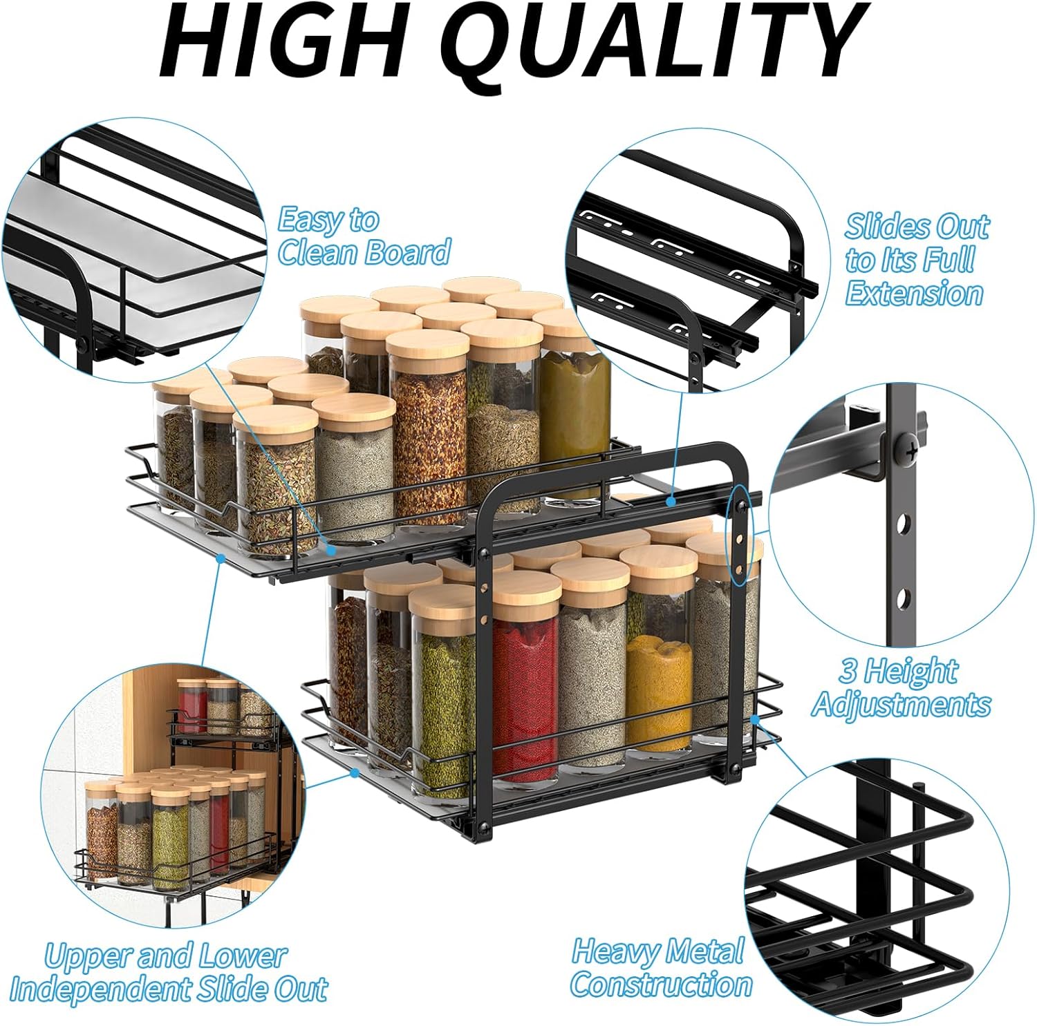 - Quality Metal Strong and Sturdiness: Our cabinet sliding spice rack is made of rust-proof metal with high quality strength to ensure durability and sturdiness. The drawers are covered with plastic plates, which keep the bottles stable and do not fall easily.