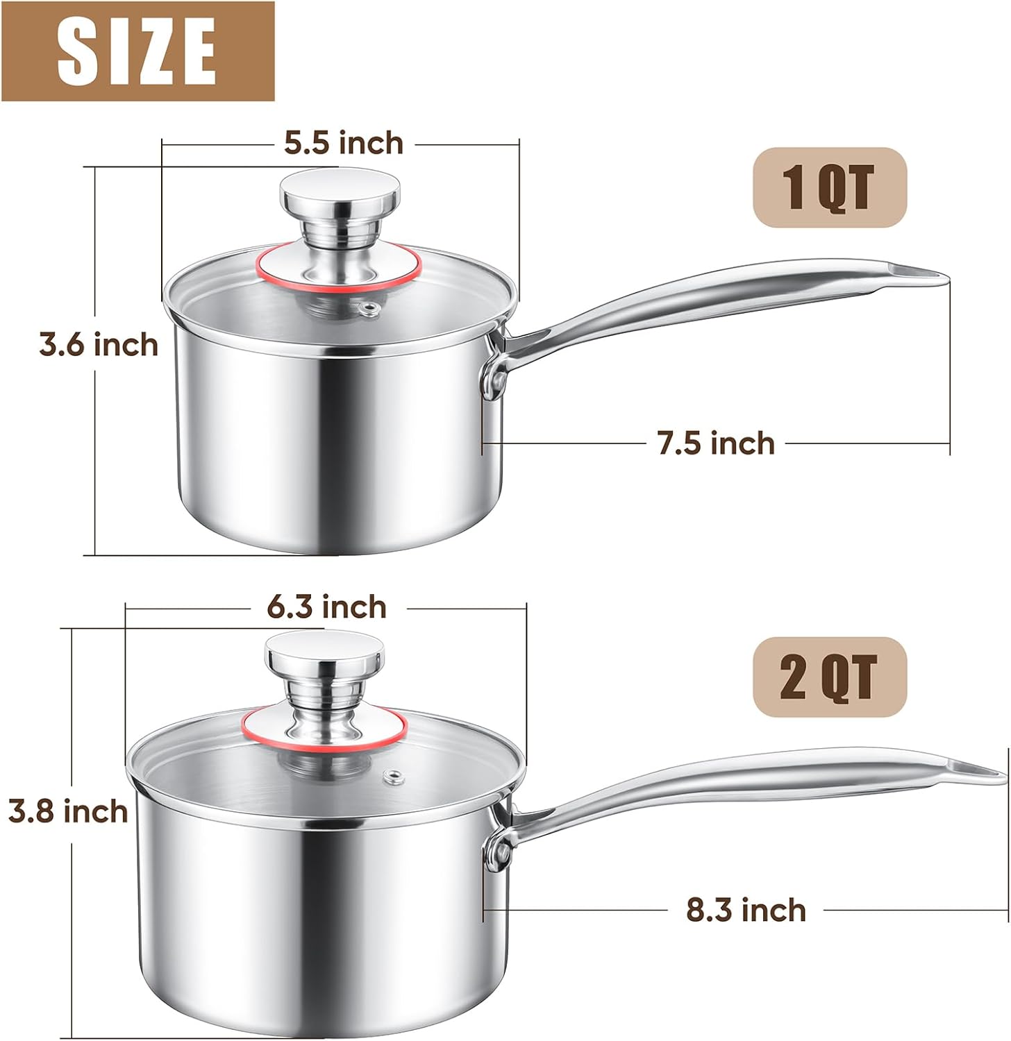 E-far Stainless Steel Saucepan Set - 1Qt & 2 Qt, Triply Sauce Pan Pot with Lid for Cooking Pasta Warming Milk Boiling Water, Small Metal Cookware for Kitchen, Induction Ready & Heavy Duty
