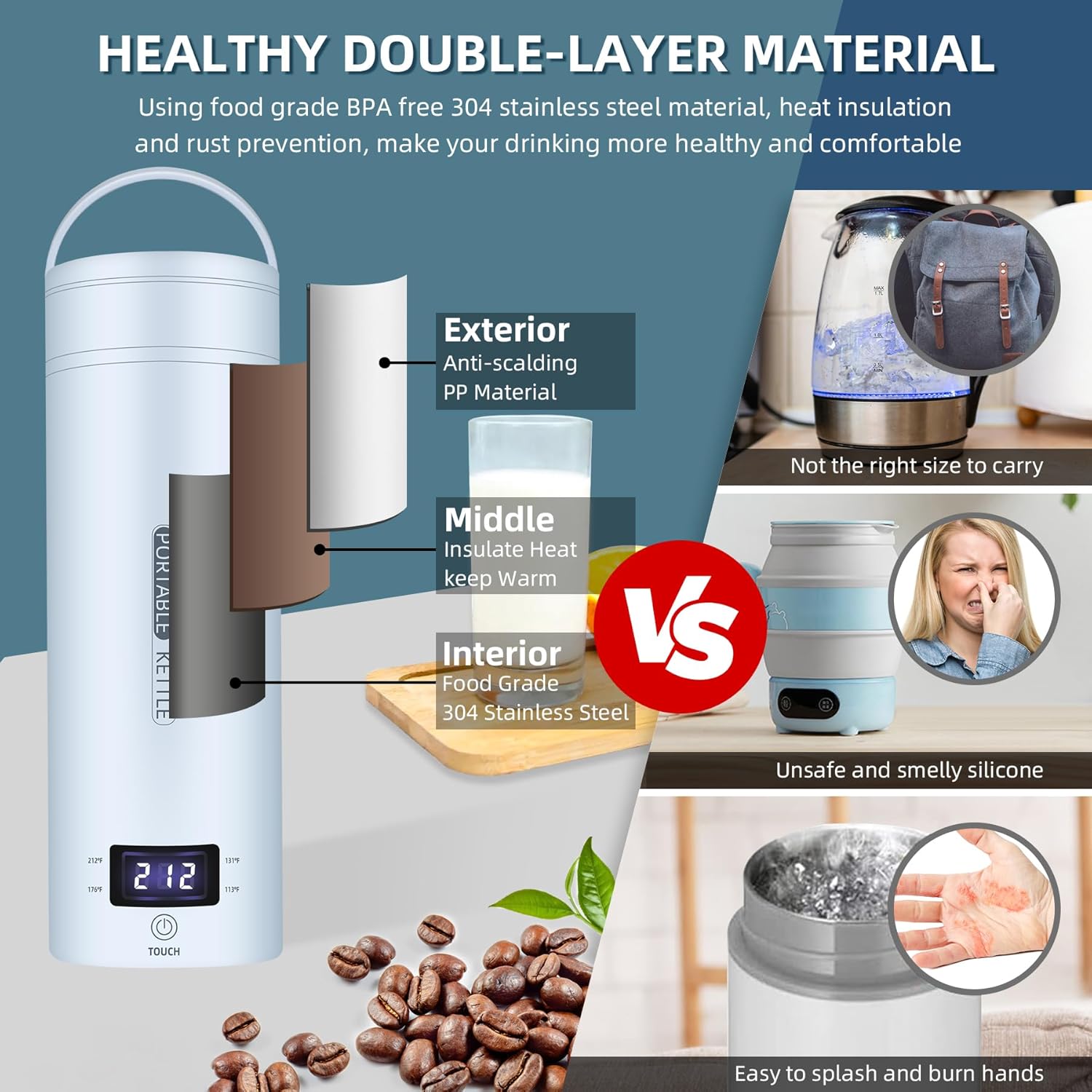 - Heat Insulation to Avoid Scalding - Small electric kettle for travel features double-walled PP insulation and 100% BPA-free 304 stainless steel to keep the water warm while preventing the surface temperature of electric water boiler from overheating. It is designed with a vent on the lid to help reduce the pressure of boiling water. You can close the lid and boil water without worrying about getting burned. Our food grade portable electric kettle provide you with healthy drinking water.