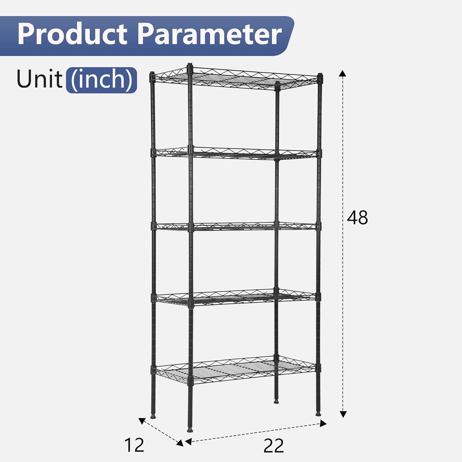 FDW 5 Tier 22L x 12W x 48H Pantry Shelves Adjustable Storage Rack Metal Shelf NSF Shelving Units for Kitchen Garage Small Places Commercial,Black