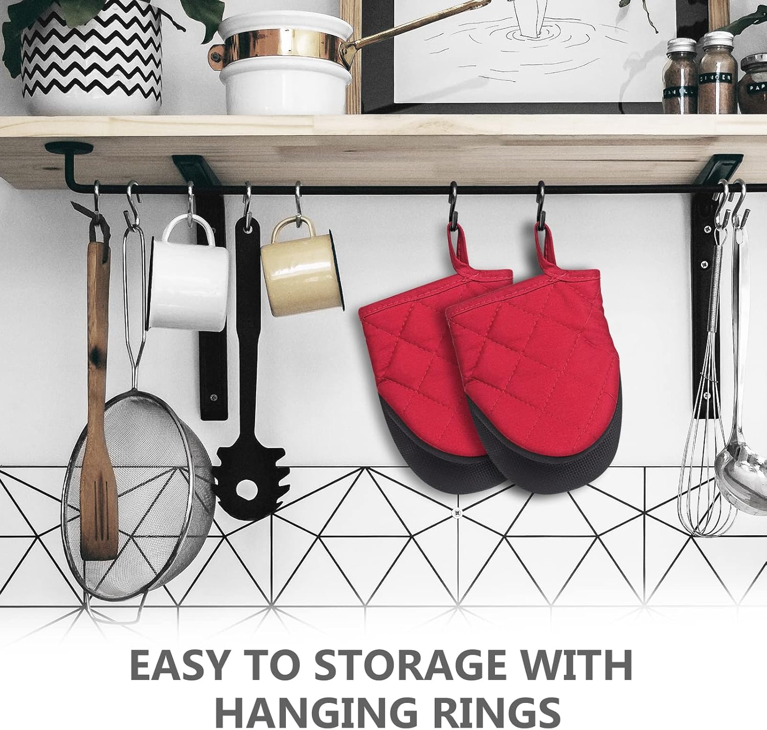 Qulable 1 Pair Short Oven Mitts - Silicone Kitchen Oven Gloves High Heat Resistant 500℉, Mini Oven Mits with Non-Slip Grip Surfaces and Hanging Loop for BBQ, Baking, Cooking and Grilling (Red)
