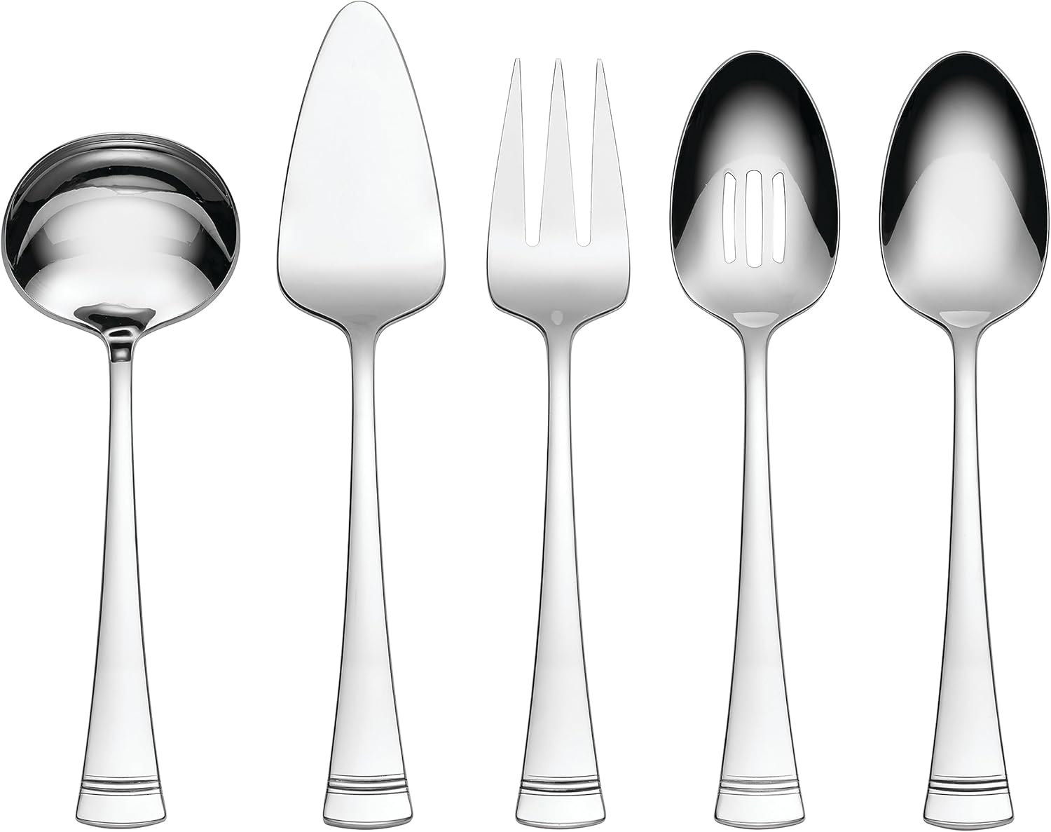 - Includes (1) serving spoon, (1) pierced serving spoon, (1) serving fork, (1) pie server, and (1) gravy ladle