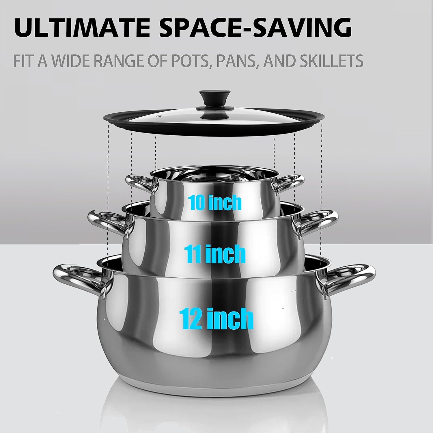 - 【 PERFECT FIT FOR VERSATILE USE 】: Lerykin lid offers versatile compatibility for all your cooking needs. Our Universal Glass Lid is designed to fit a wide range of pots, pans, and skillets with diameters of 10", 11" and 12". Say goodbye to cluttered cabinets with multiple lids for different cookware. Our Universal Lid is the ultimate space-saving solution, eliminating the need for multiple lids. Whether you're cooking up a storm or reheating leftovers, this lid has got you covered.