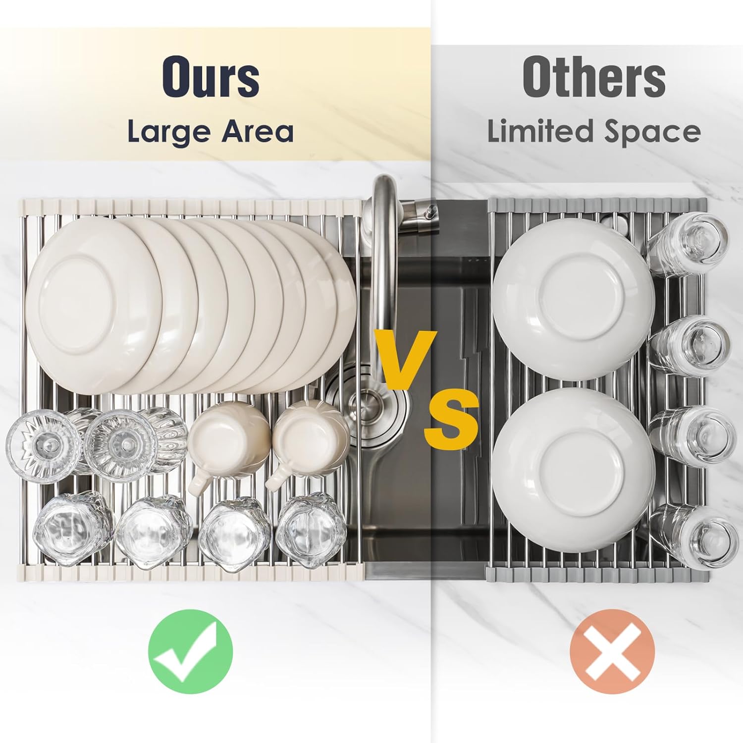 - [Multipurpose Drying Rack] - Perfect for air-drying kitchenware such as dishes, mugs, bowls, pans, glasses, cups, plates, cookware, cutlery, saucepans, bottles, and even fruits and vegetables. A must-have kitchen gadget.