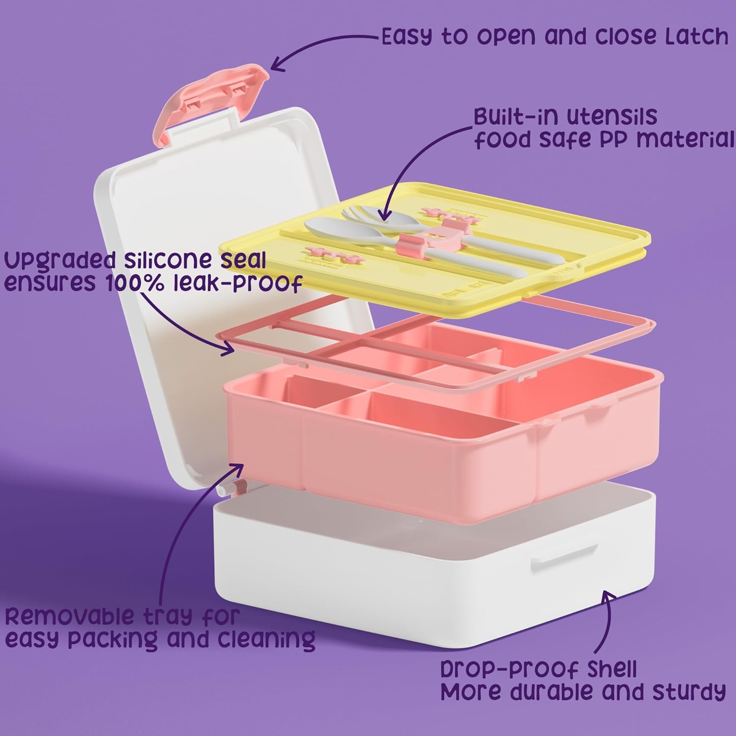 - PREMIUM BENTO LUNCH BOX: This Kids bento sanck box is designed with airtight lids & 4 individual seal compartments to keep foods separate/fresh, allowing you pack a balanced meal with ease. The bento box is Tray Top Rack Dishwasher Safe ( under 80℃) & freezer safe, and its food tray is microwave safe for on-the-go parents. Comes with its own set of utensils that snap right onto the lid for easy storage. Kids friendly latches designed & vent plug design, easy for kids small hands to open & close