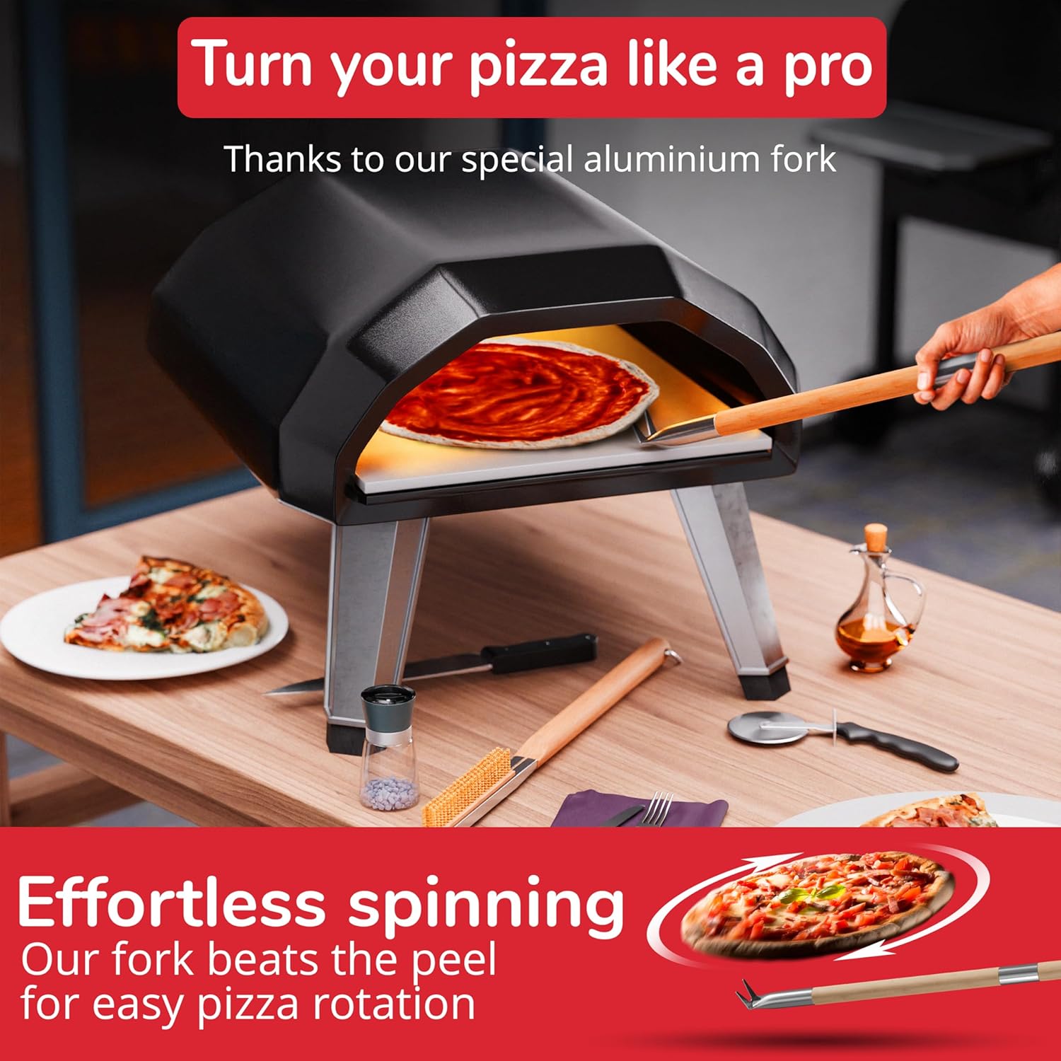 - Pizza Spinner Fork & Poker - This 2-in-1 pizza spinner doubles as a pizza poker and rotator. Makes cooking pizzas so much easier, offering a versatile alternative to traditional pizza peels. It prevents overcooking and ensures even cooking.