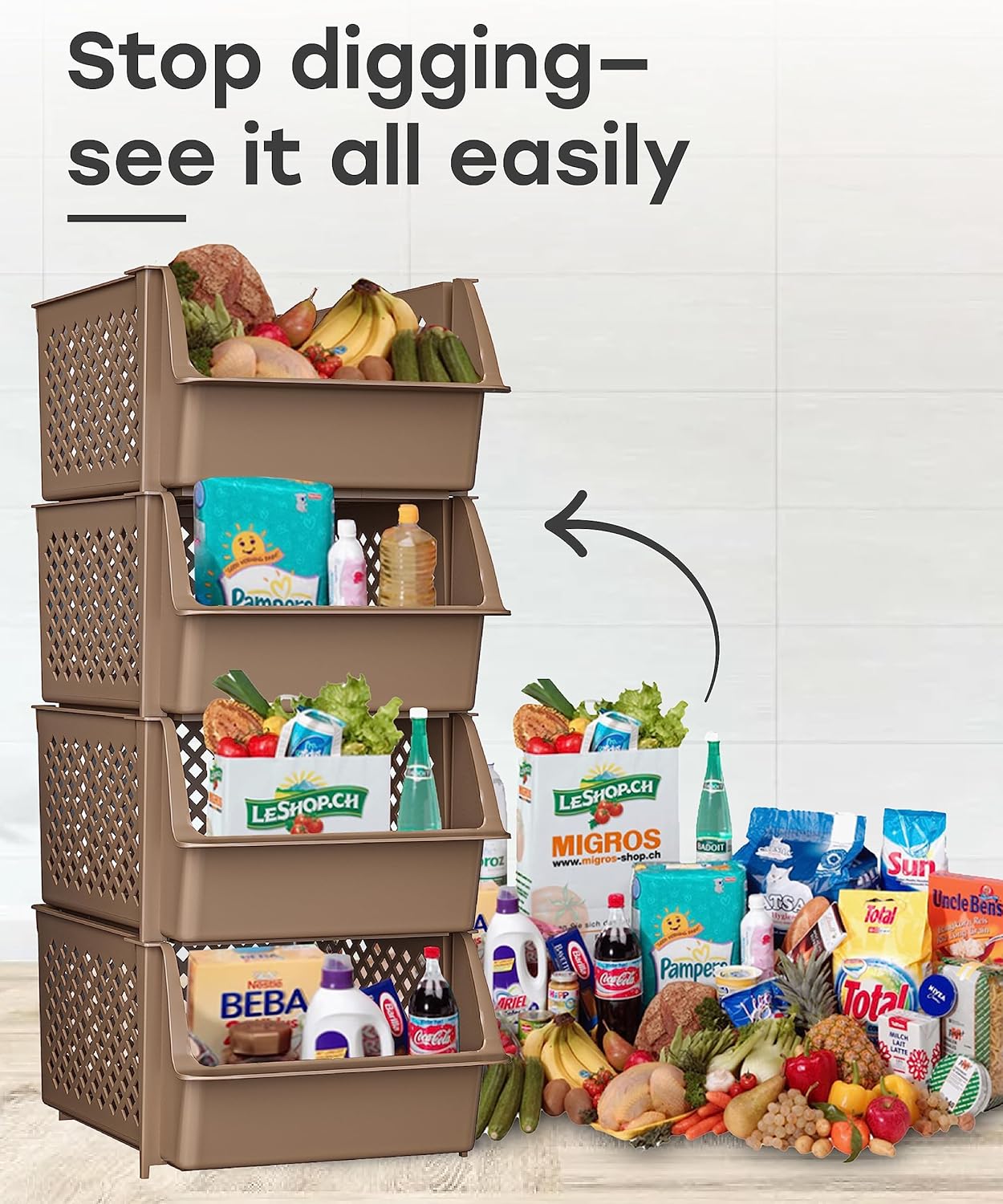 TidyFriend Stackable Storage Bins for Pantry - 4 Pack Medium Stackable Bins For Organizing Food, Kitchen, and Bathroom Essentials (Brown)