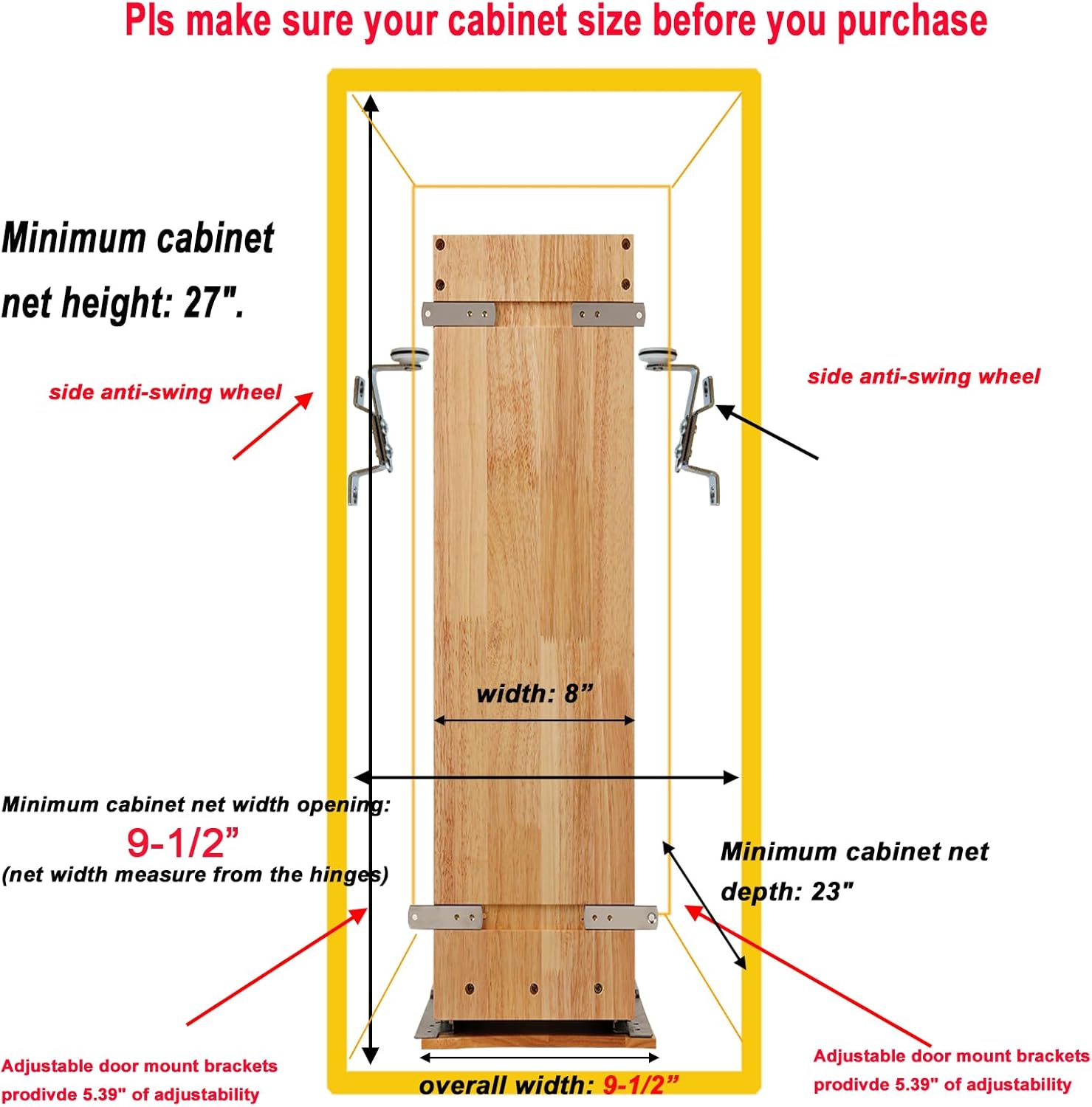 - ※ 【Large Storage Space】This spice rack organizer size is 8" W x 21.9" D x 25.2" H, the overall width included the sildes is 9-1/2" W , require at lest 9-1/2" W cabinet net width opening (net width measure from the hinge), Minimum cabinet net depth: 23"D. This pull out spice rack each layer can hold at least 14 jars spice / seasoning! Maximum save your space, keep your cabinets clean and tidy and stay away from clutter! The height of each tier is fixed.