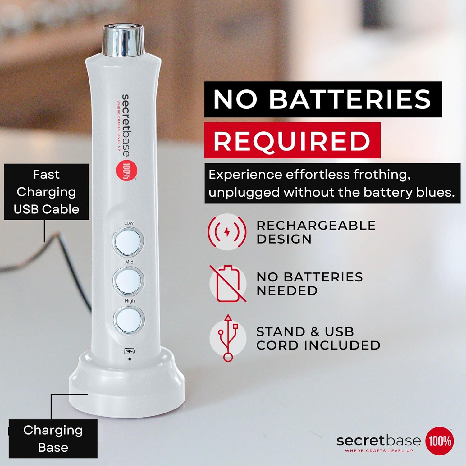 - Rechargeable For Reliable Power: Let’s face it. Battery-operated frother chew through batteries like snacks. Secretbase rechargeable wand eliminates the hassle and cost of constantly replacing batteries. Plug it into a wall charger, or computer, and you’ve got lattes at your fingertips.