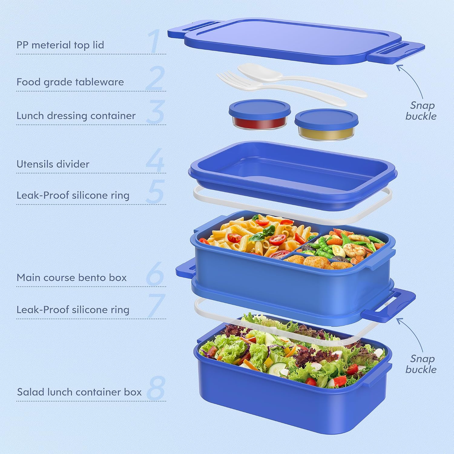 - ă Ideal Bento Lunch Containers Box for to GoăOur bento lunch box for adults with utensils contains 5 practical compartments and 2 sauce dressing containers, is perfect for putting your pasta, chicken, salad, sandwich, fruit, snacks or sushi in it and enjoy it when and where you like. Five compartments help to plan a well-balanced diet not only for men and women to keep fit, but also for girls and boys to have a comprehensive nutrition.