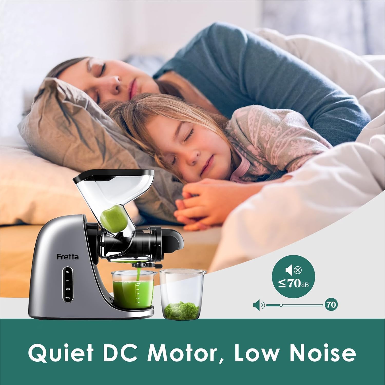 - ă Powerful yet Quiet DC MotorăFretta's masticating juicer machines are powered by a robust 200W DC Motor. Its high-torque, low-speed design operates quietly at low RPM, extracting deep nutrition from your favorite fruits and veggies. Enjoy a peaceful juicing experience with noise levels below 75 decibels.