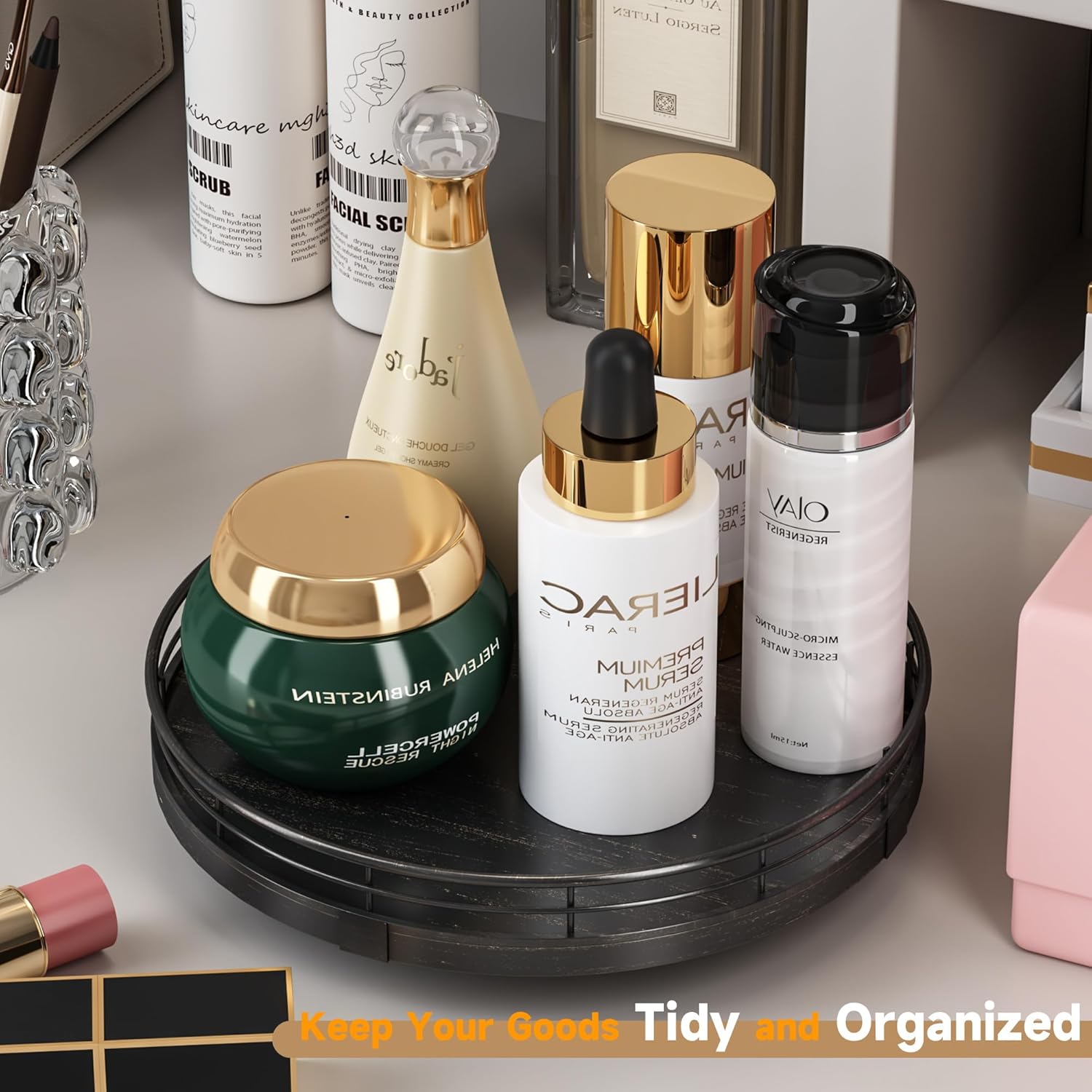 - πππππππππ πππ:This lazy susan is enough to be used nearly anywhere, perfect in the bathroom, bedroom, laundry room, office, etc. Keep your bathroom counter organized with this bathroom tray for toiletries, lotion, washcloth, cotton swabs, soap and scrubber. Using a bathroom vanity tray to keep all your daily skin care and makeup. On the bedroom counter, ideal to organize perfumes. Good idea for the office desk and craft room to organize. Keep your coffee stuff perfect at your coffee