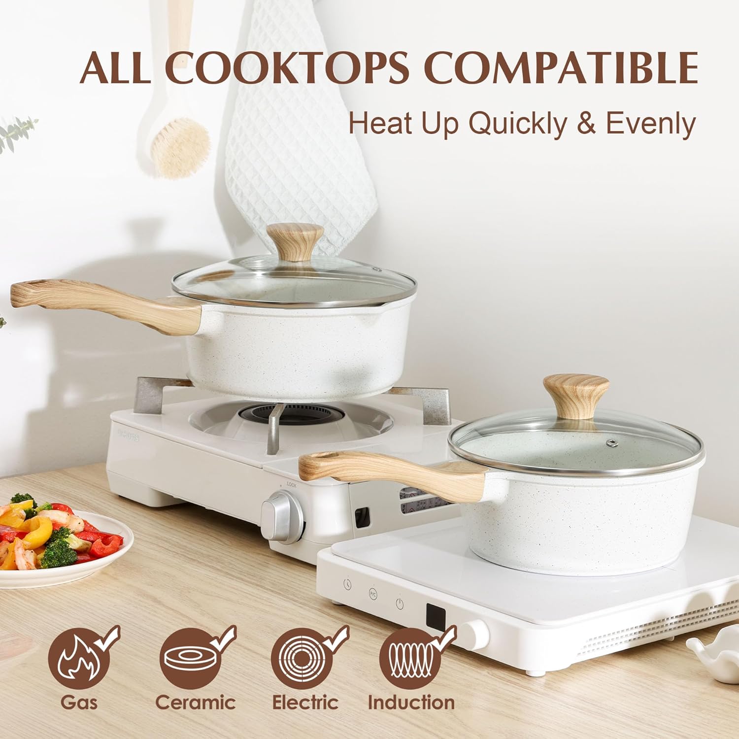 - Suitable For All Stoves - High magnetic conductive stainless steel base allows the 1.5 qt saucepan with lid nonstick to work on all cooktops, including induction. The core of small sauce pan is made of cast aluminum, which is sturdy, long-lasting and heats up quickly and evenly.