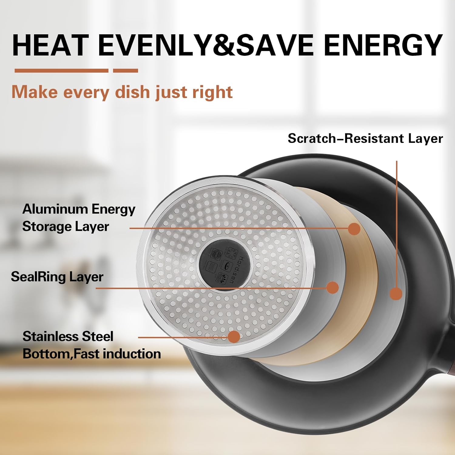 - ăAll Stove Compatibleă: The stir fry pan skillet is designed with a high magnetic conductive stainless steel base, making it compatible with all types of stovetops, including induction; the advanced die-casting aluminum technology prevents warping, ensures quick and even heat distribution, and saves you time and energy in the kitchen