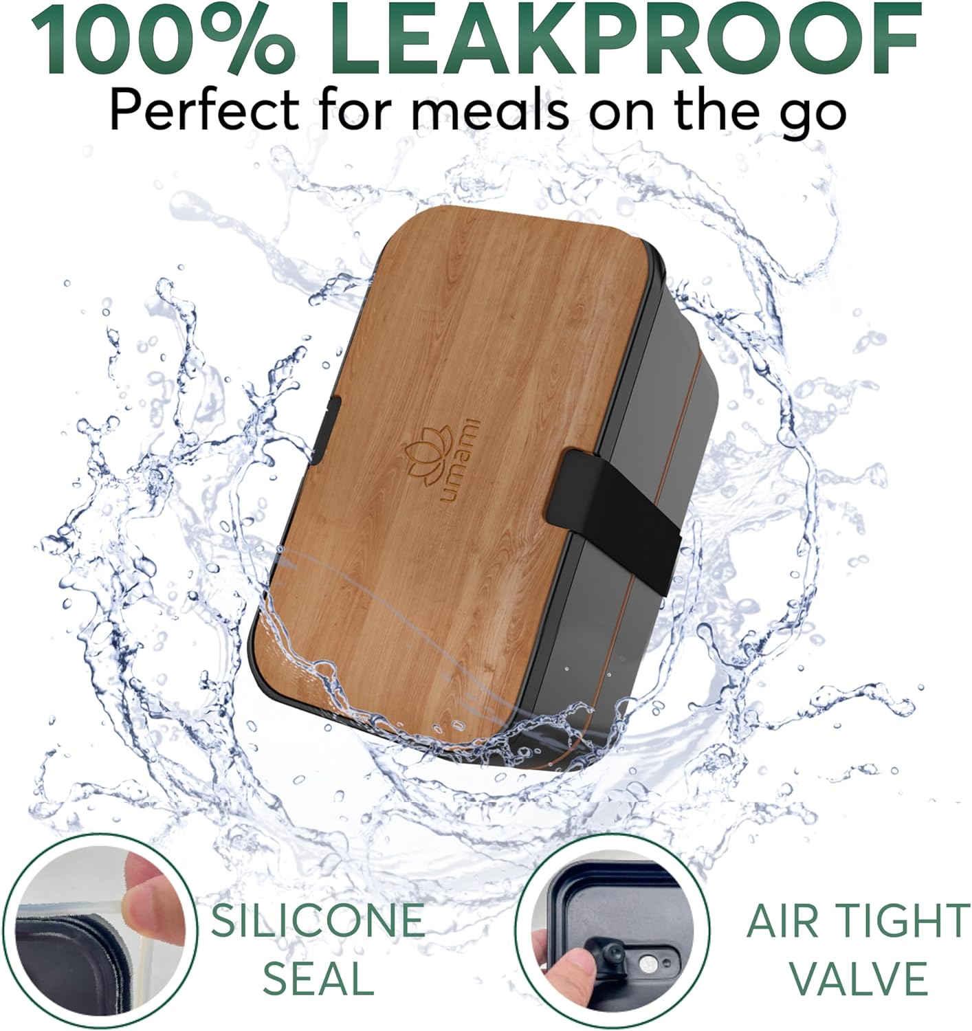 Umami Premium Lunch Box Containers w/ 4 Utensils, 2 Sauce Jars, Nestable Space-Saving Bento Box Adult, 100% Leakproof, Microwavable Lunch Containers for Adults, Cherry Black, 50 oz