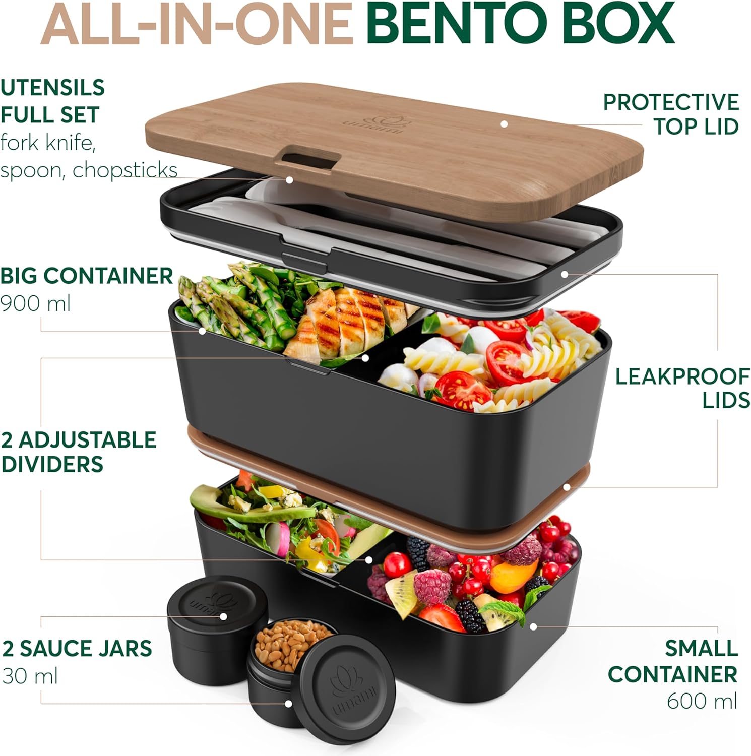 - Complete set - includes 4 utensils, sauce jars, and 2 movable dividers for ultimate convenience. Everything you need in a lunch box bento for adults.