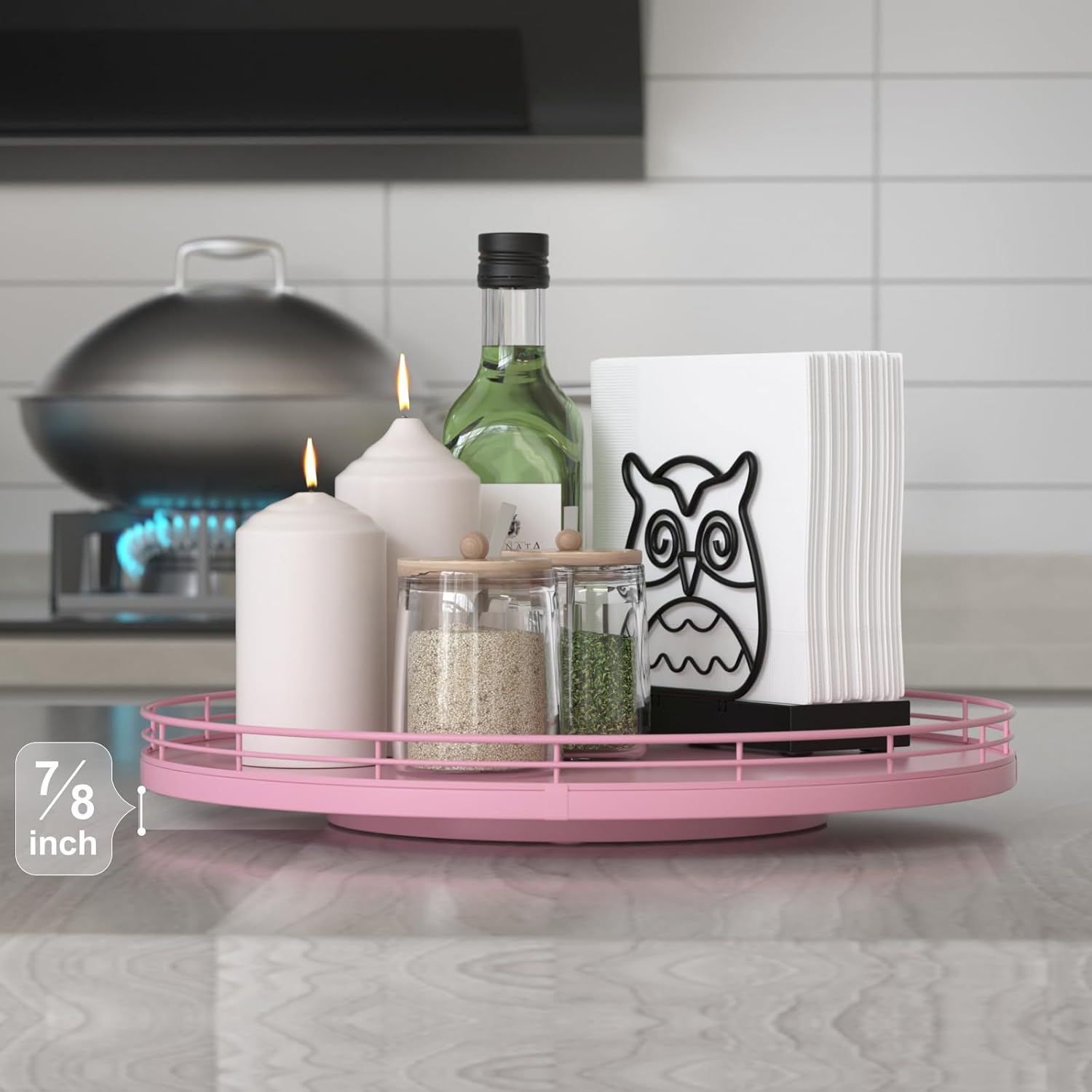 - ๐ง๐ต๐ผ๐๐ด๐ต๐๐ณ๐๐น ๐๐ฒ๐๐ถ๐ด๐ป: The turntable tray features a smooth and silent 360ยฐrotation; Bottom slip-resistant pads for stability and protect your countertop from scratches; Raised edges on each organizer tray to keep items from falling out; Easy to use, no installation required