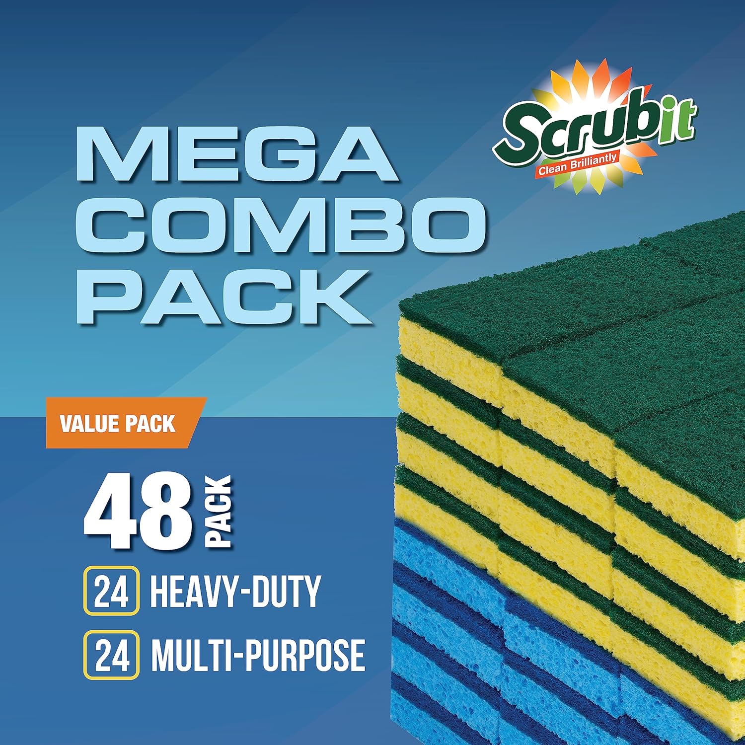 - INCREDIBLE SCRUBBING POWER: Each sponge has two sides: a soft, absorbent sponge and a hard, tough scouring pad. That means you’ll take less time dishwashing, scrubbing pots, and cleaning walls, floors and work surfaces.