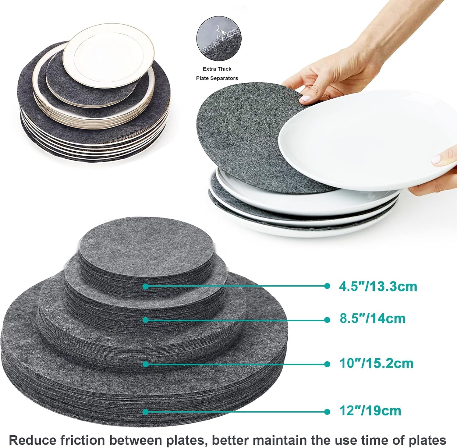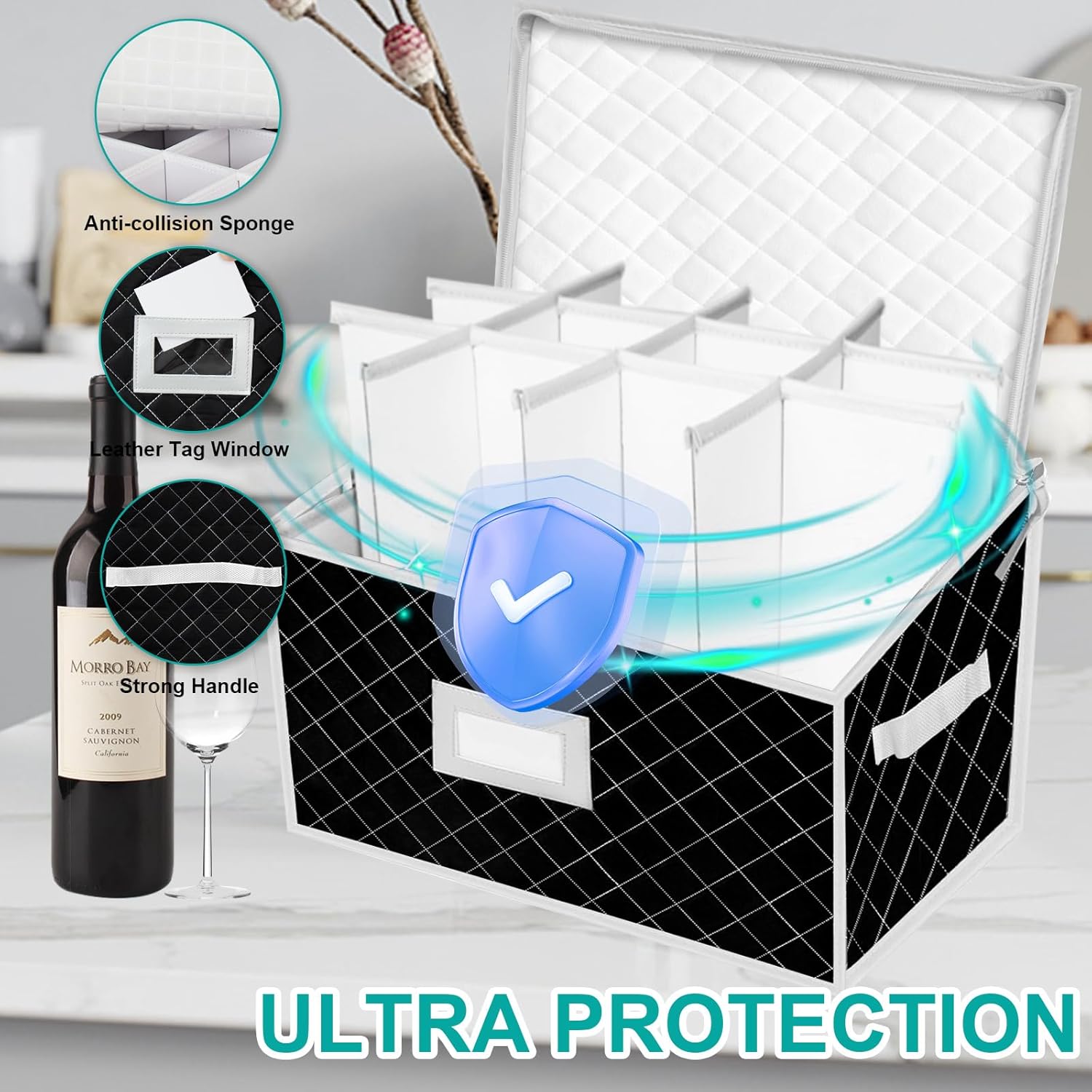 - 👍【Quality Material】: Both the stemware and mug storage bins with 2 sturdy handles.They are hard shell constructed by thick hard cardboard covered with quilted oxford cloth, each with 12 compartments to keep your glasses/cups from bumping into each other. For 4 dish storage containers, we provide 12 free felt separators, in total 48 sheets for you to put between plates to prevent scratches. Please rest assured that they will provide the best protection for your fine/delicate and fragile dishes.