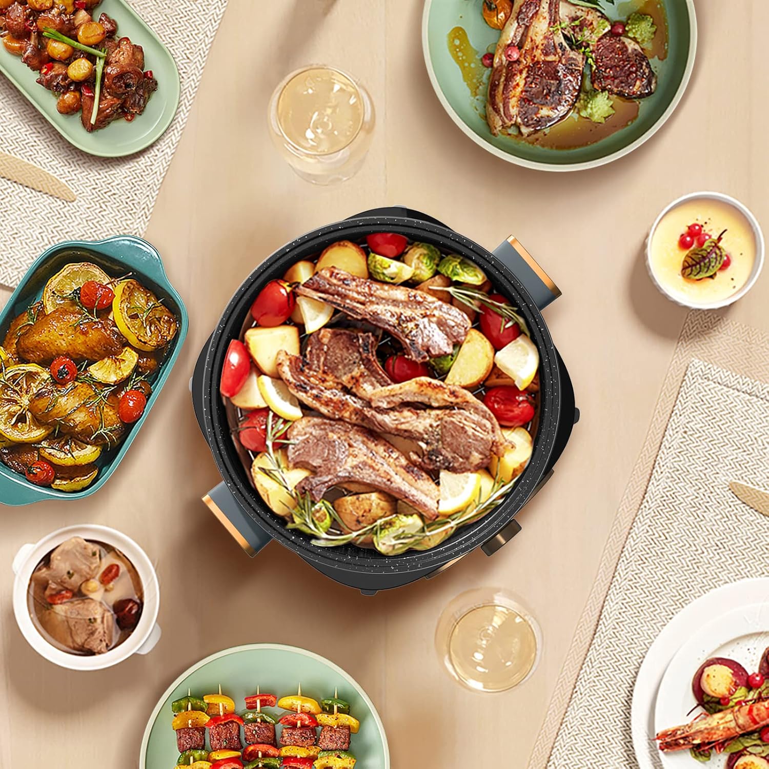- Featuring with a pair of anti scalding handle, the electric shabu shabu pot also equipped with four non-slip rubber feet and holes for ventilation and heat dissipation on the bottom of the pot. Within the tempered glass lid, you can easily check the food and ensure the water does not dry out.