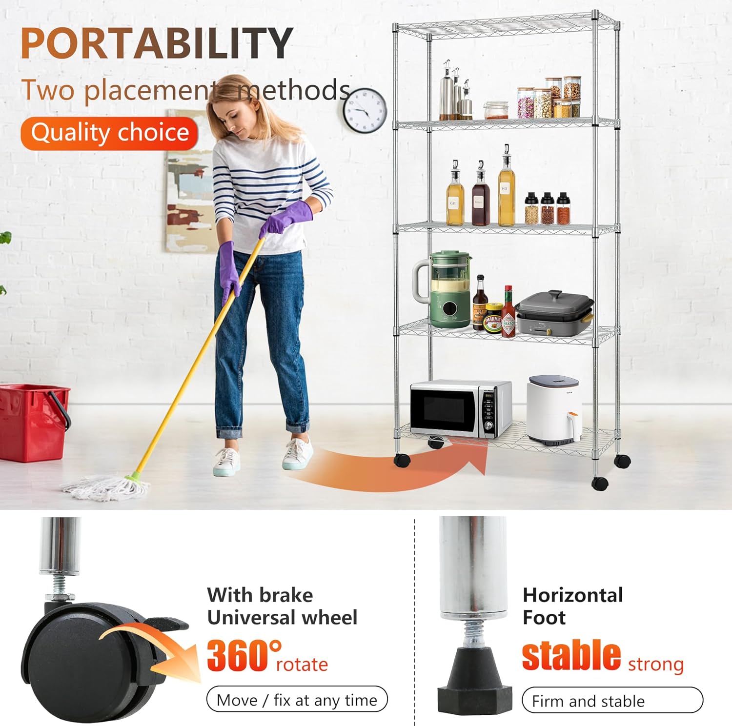 FDW Adjustable Storage Rack Wire Shelf with Wheels - 5 Tier Metal Shelves for Small Spaces - Easy Assembly, Chrome