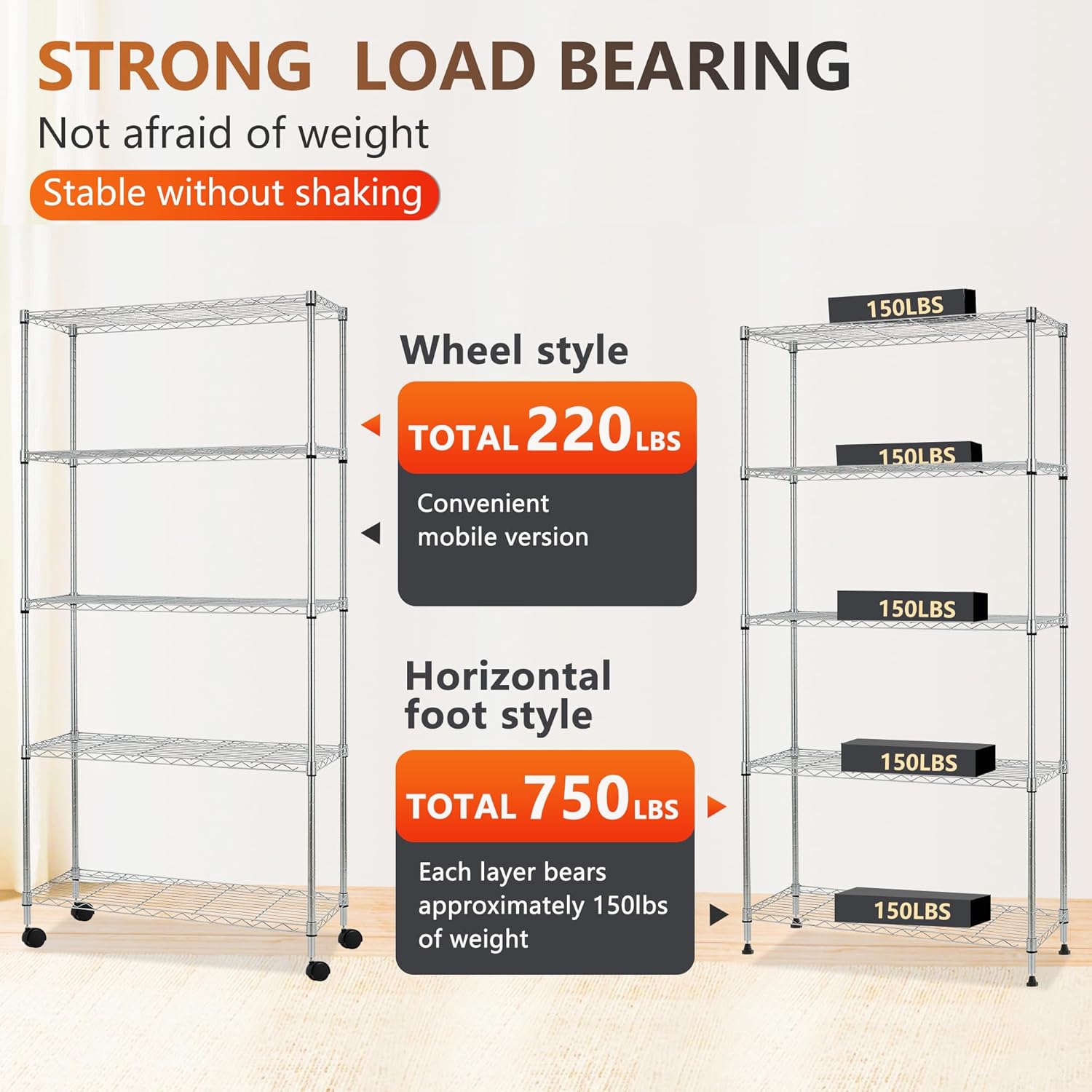 - 1. Impressive 250 lbs Weight Capacity per Shelf: Each storage shelves boast a remarkable 250 lbs weight capacity, the entire 5 Tier Shelves can hold up to 1250 lbs,providing robust support for heavy items. This storage rack is Ideal for storing a wide range of items, from books and kitchen supplies to heavy tools and equipment. Enjoy peace of mind knowing your belongings are secure on these sturdy wire shelf.