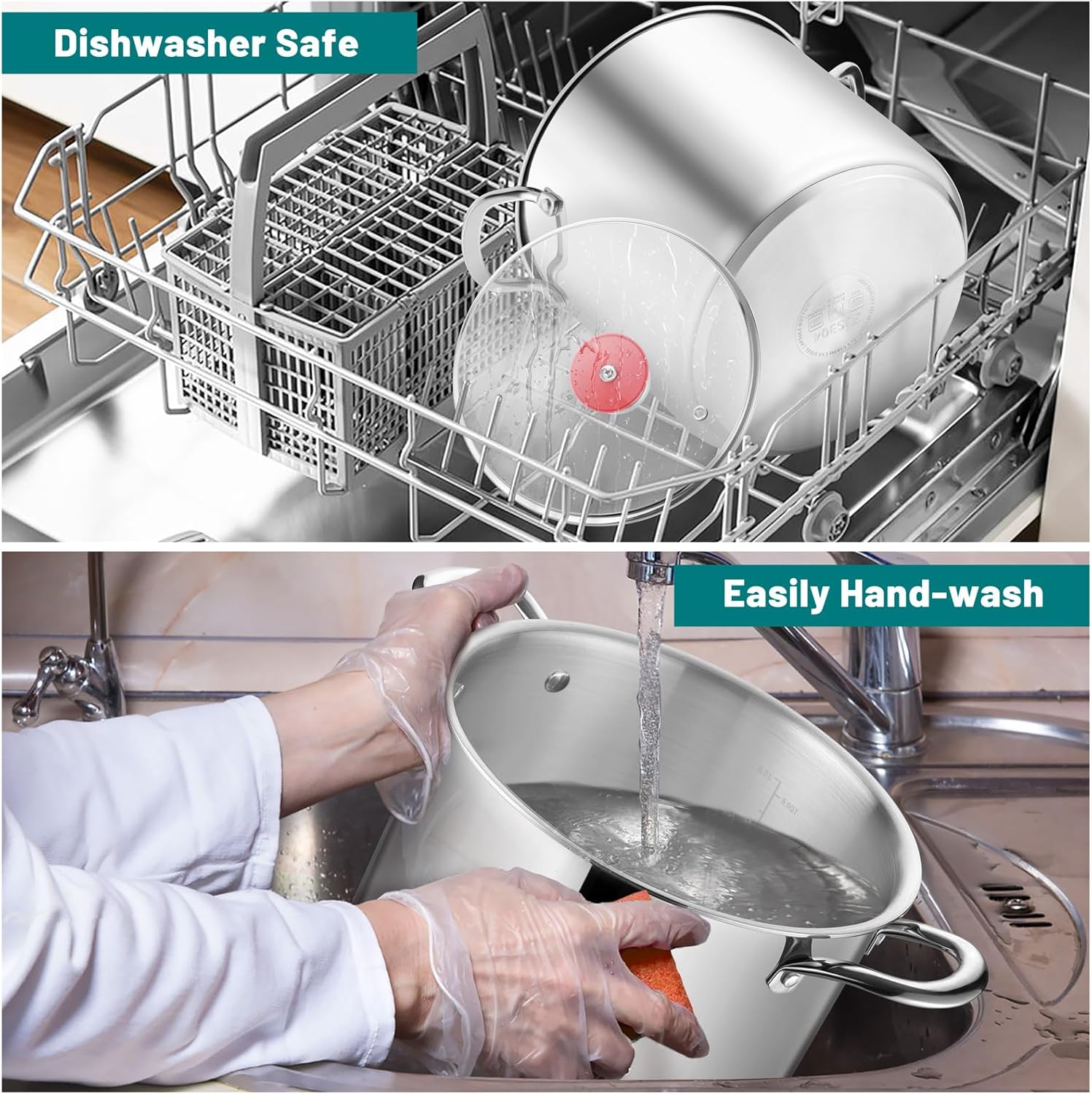 - DISHWASHER SAFE β The 10 quart stock pot internal brushed surface is wear resistance and less food sticking on the bottom, External mirrored surface keeps shiny and stylish, Both the pasta pot and glass lid are super easy to hand-wash with soft sponge and dishwasher safe to save your time, An ideal gift for your families and friends at Christmas, Halloween, Birthday, House Warming, etc.