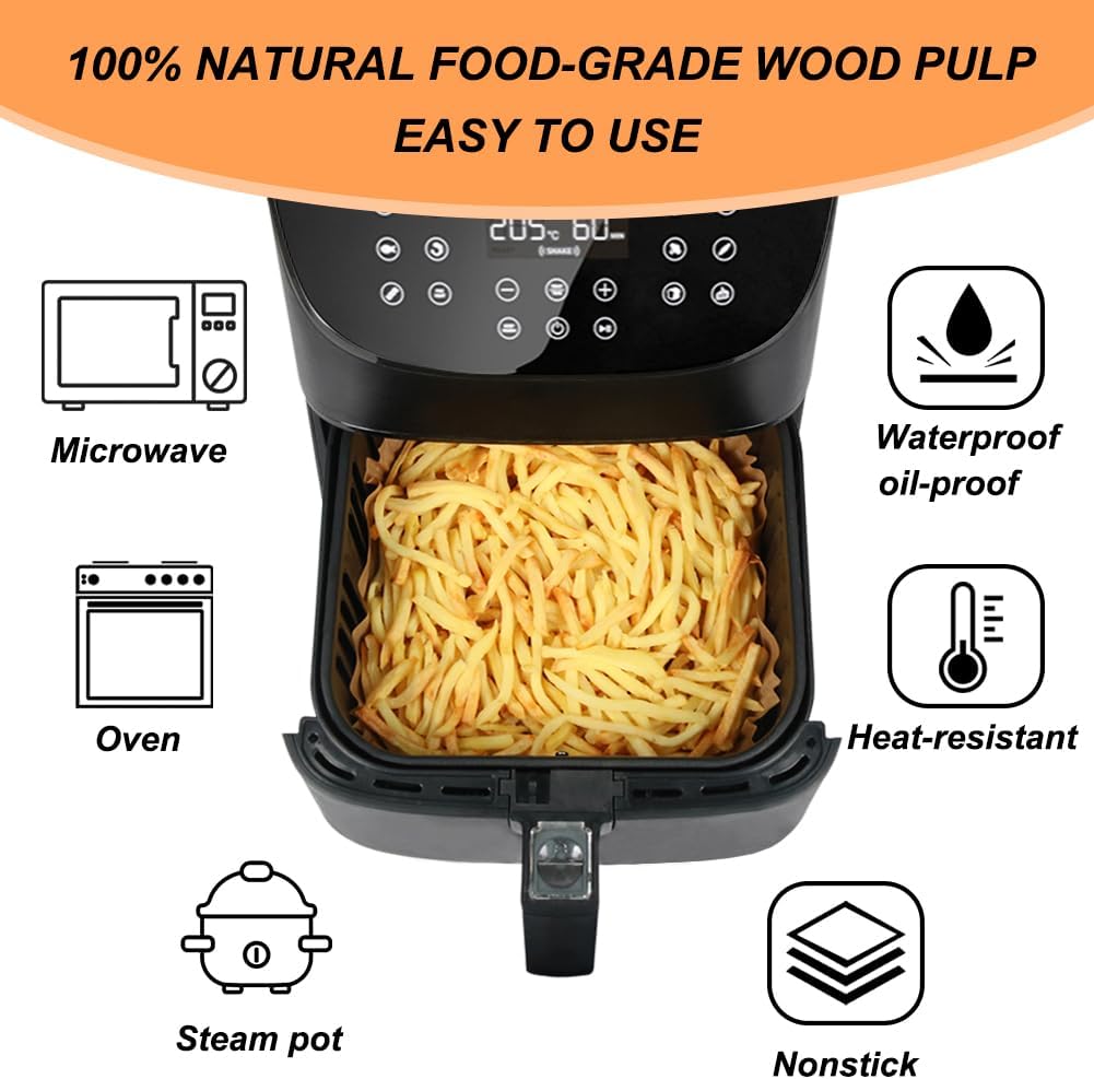 - PREMIUM FOOD GRADE MATERIAL: Made from 100% food-grade pulp with a food-grade nonstick coating, unbleached, nonstick, grease-proof, waterproof, and non-absorbent, these disposable air fryer liners are 100% safe for daily use.