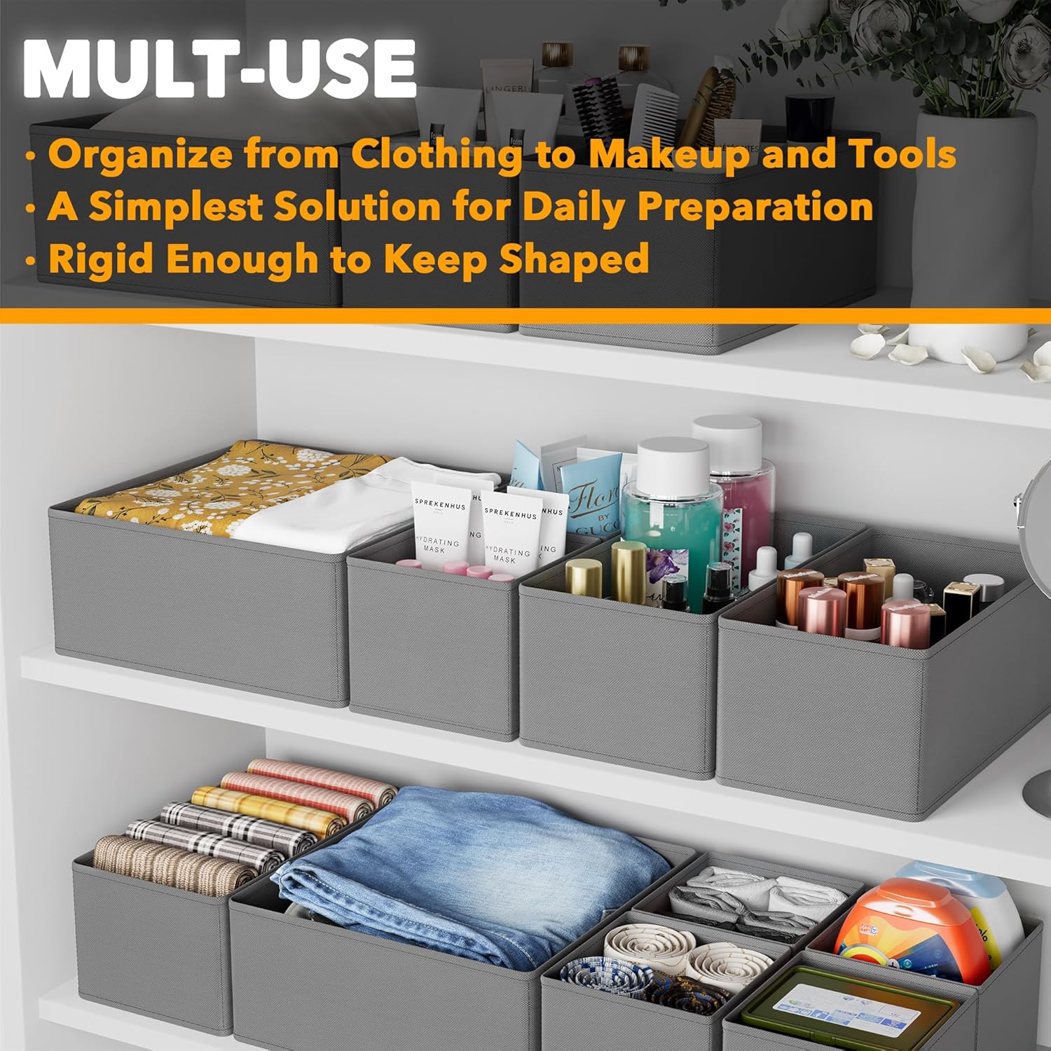 - Mult-size: 3 size bins can be make smaller or larger storage parts to stay organized and save space; Sort clothing, baby clothes, bra, socks, underwears, scarves, tools, cutlery, medicine, vitamins, jewelry, makeup and much more.